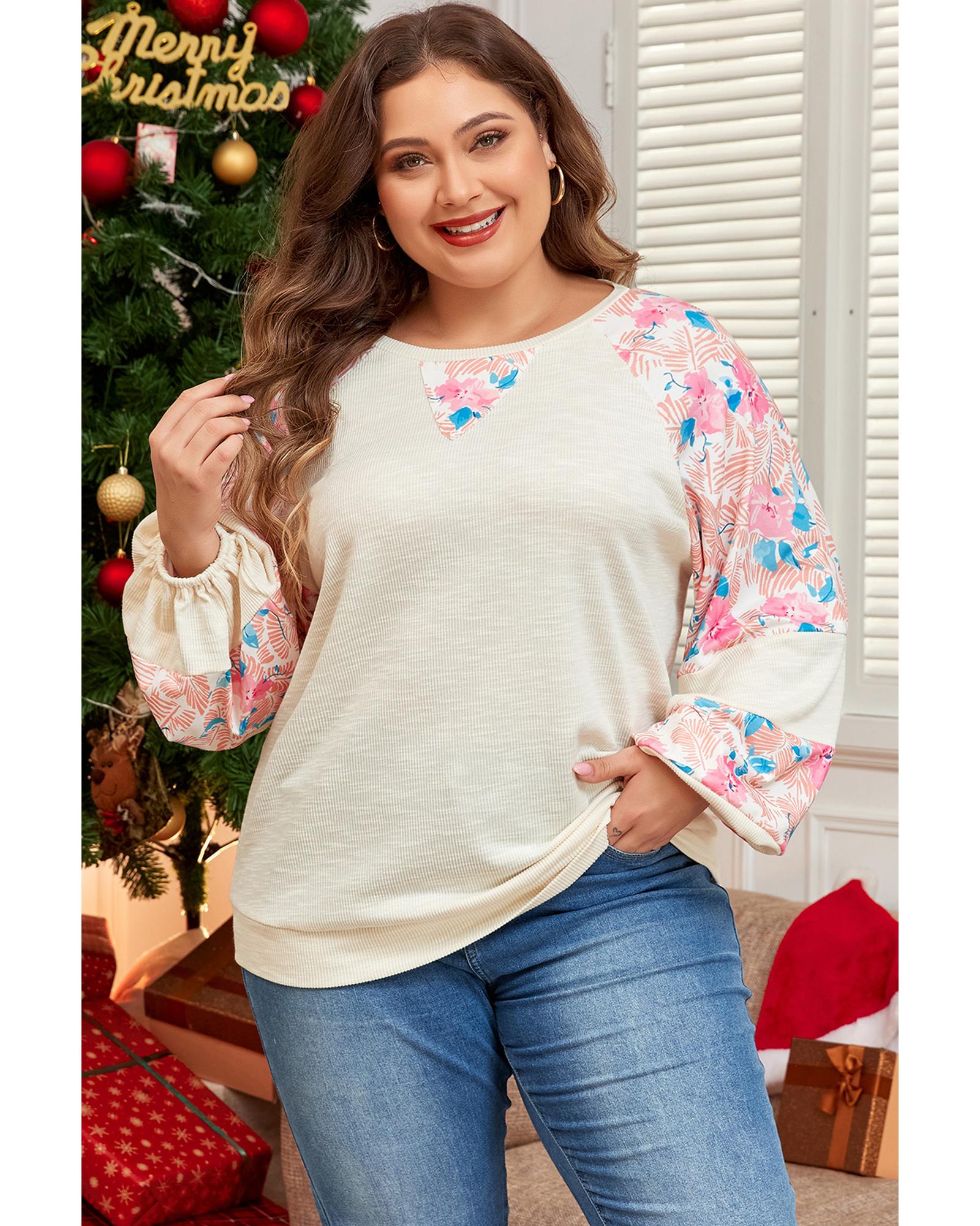 Apricot Plus Size Floral Patchwork Ribbed Puff Sleeve Top – 3X