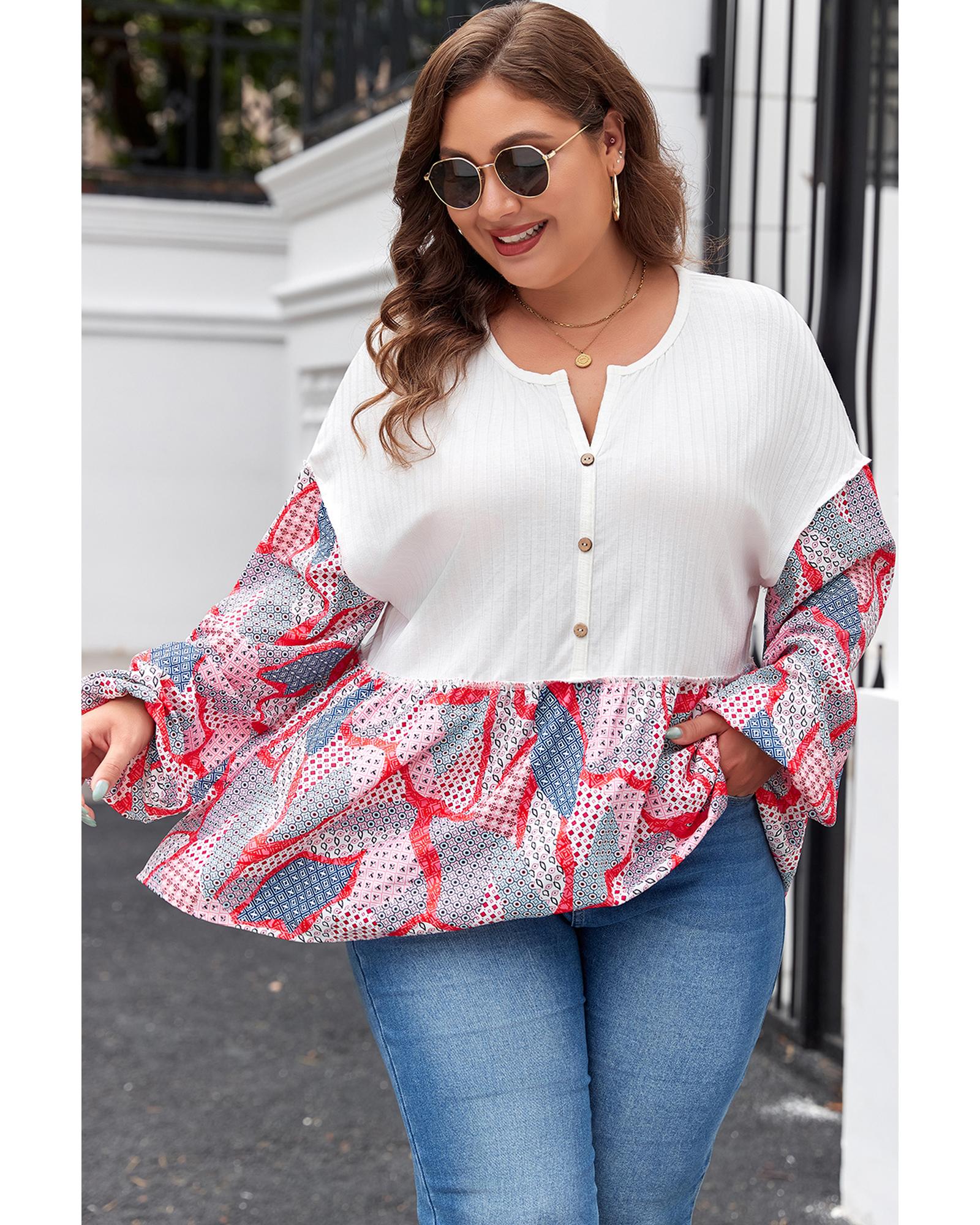 Apricot Plus Size Printed Patchwork Textured Buttoned Blouse – 3X