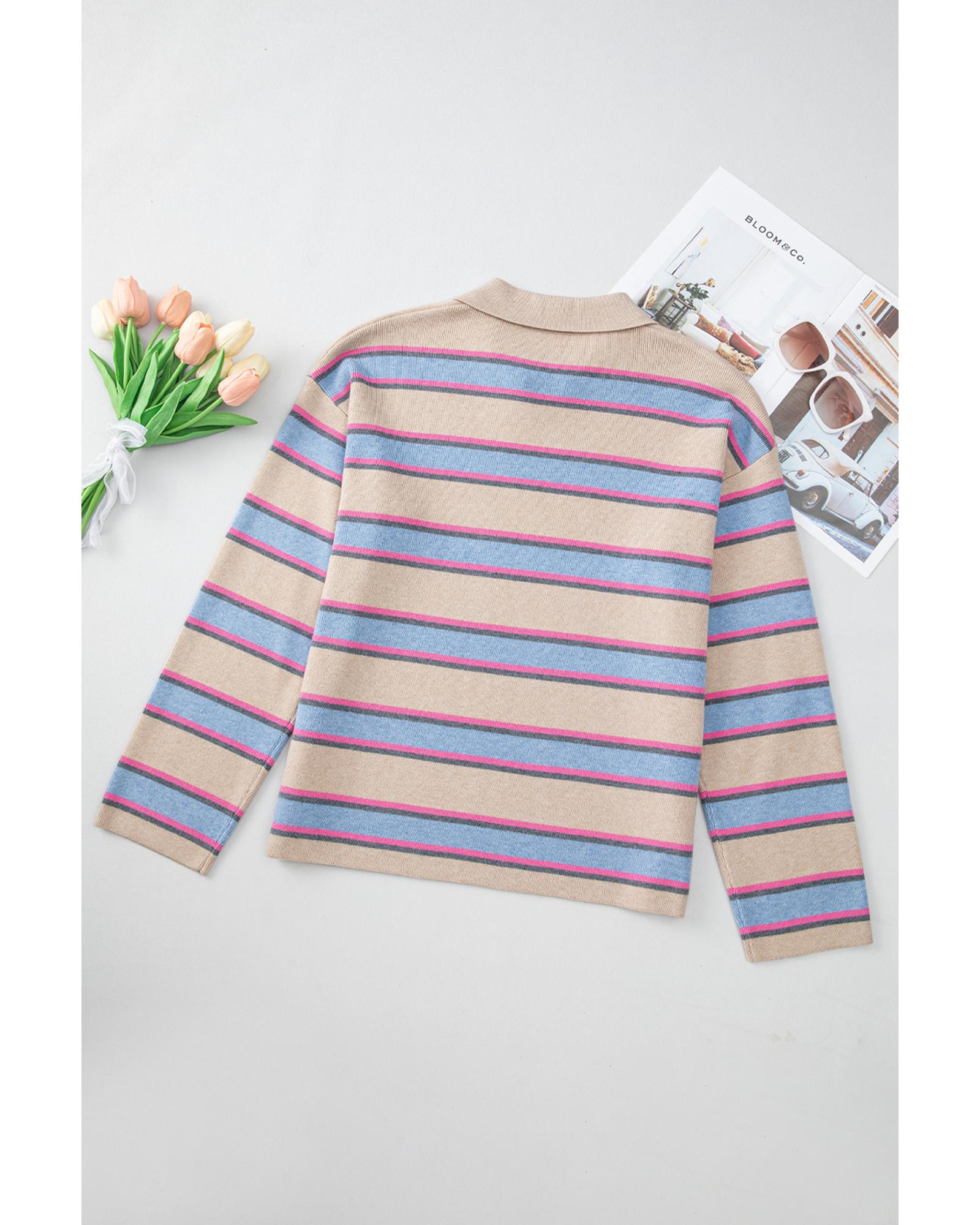 Apricot Stripe Collared V Neck Drop Shoulder Loose Sweater – L