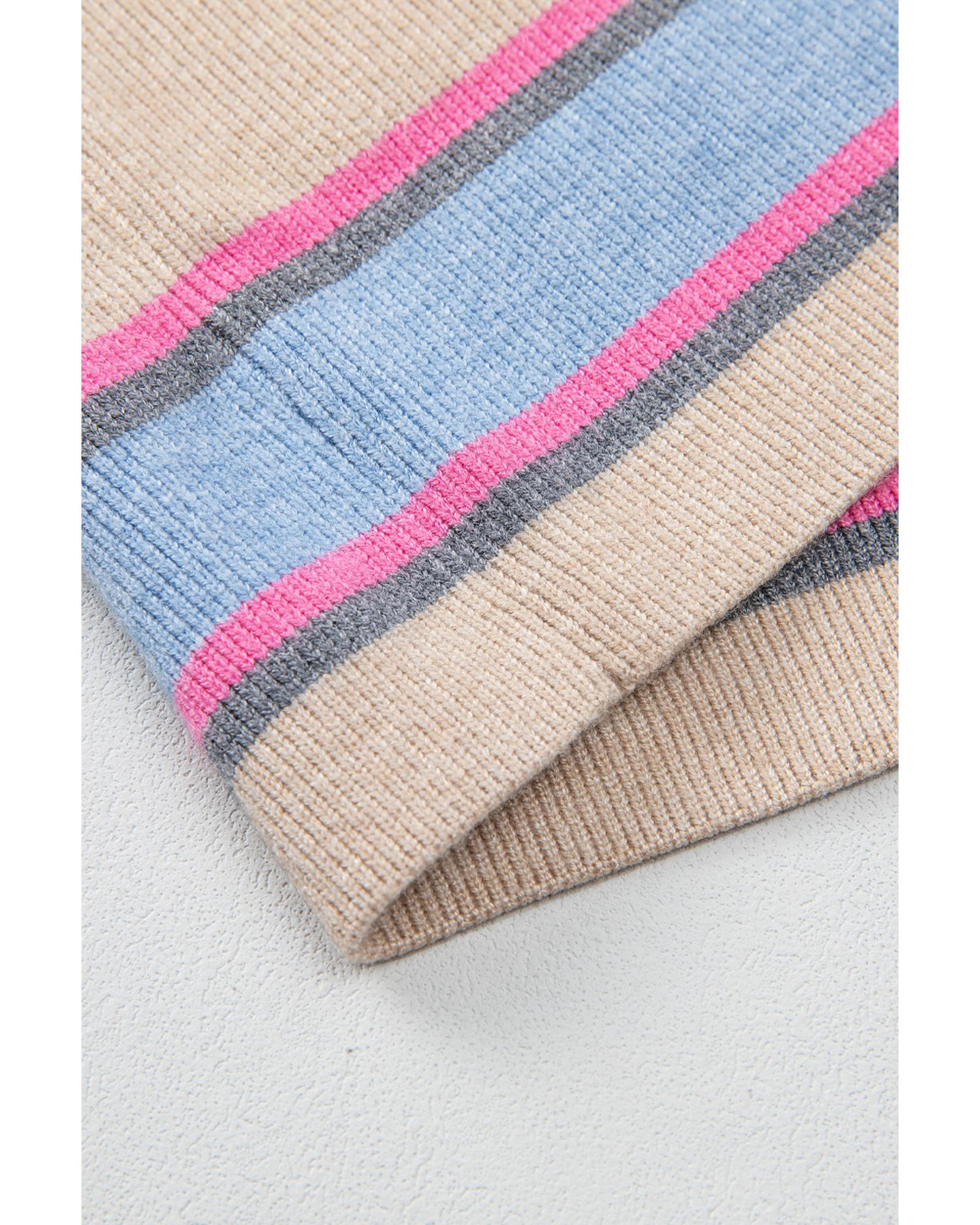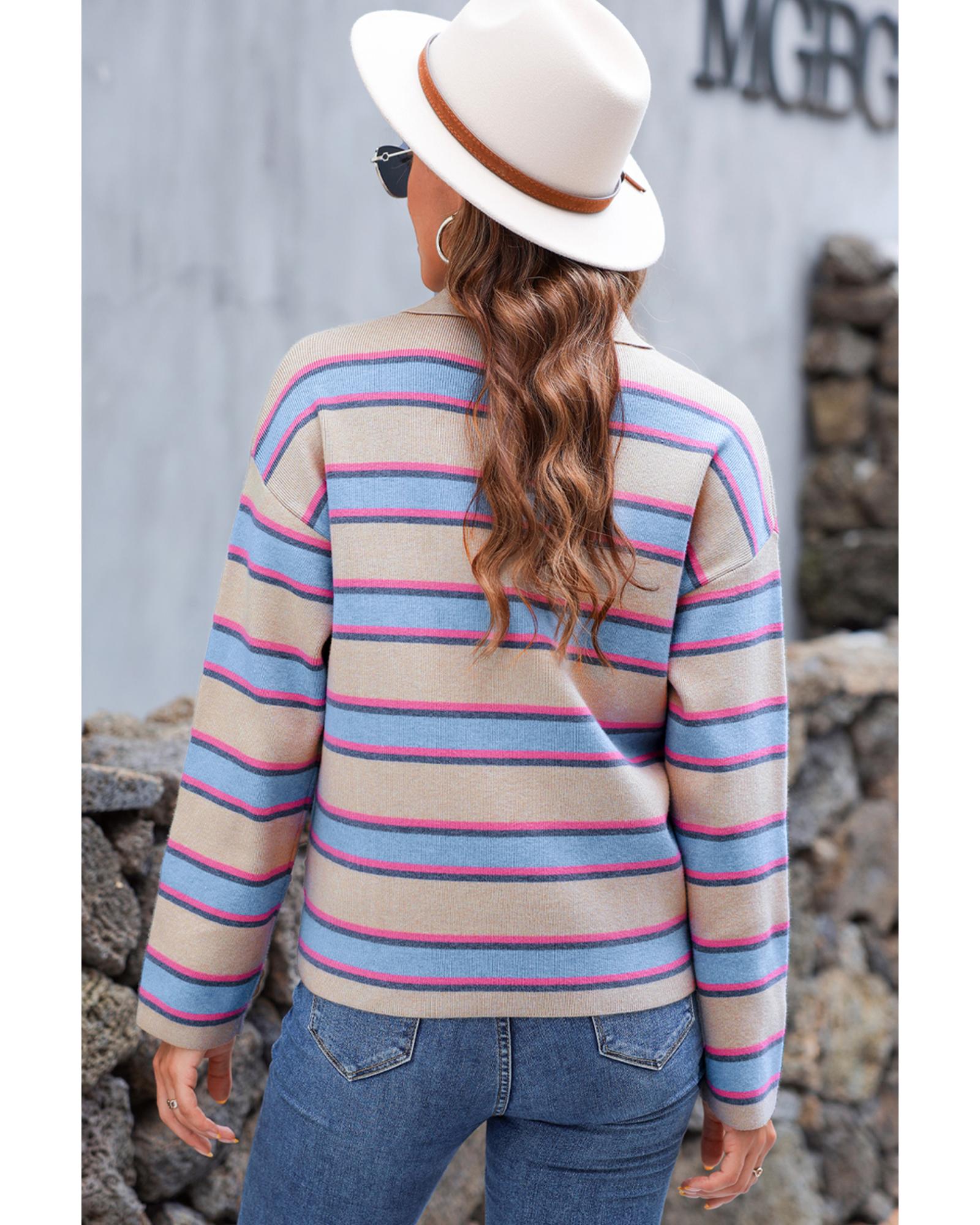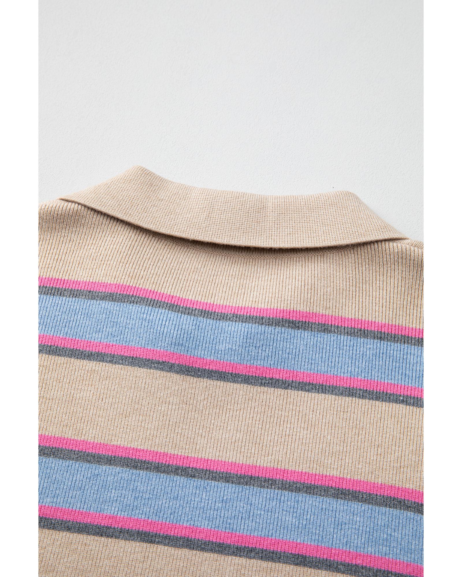 Apricot Stripe Collared V Neck Drop Shoulder Loose Sweater – S