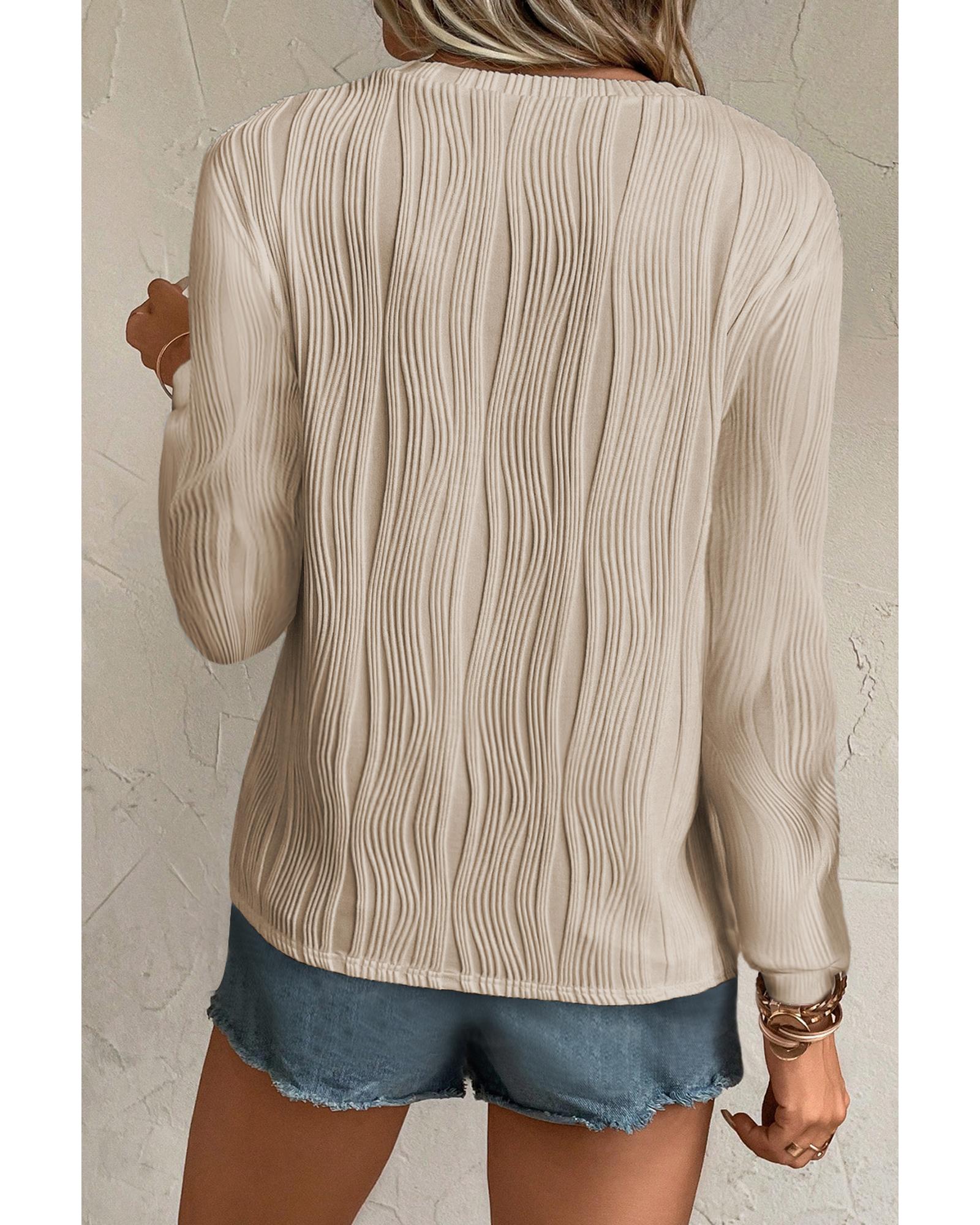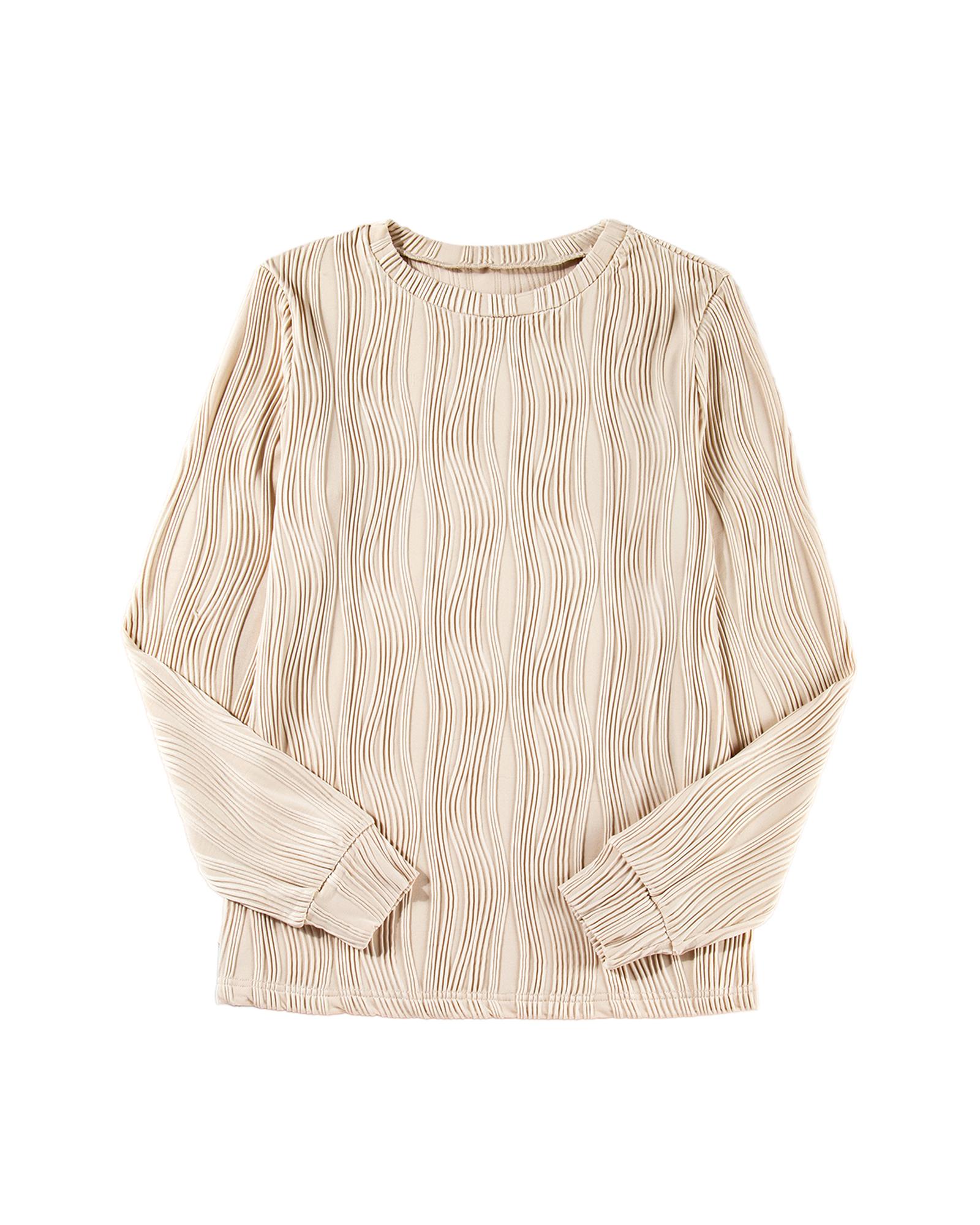- Apricot Textured Wavy Round Neck Long Sleeve Top
