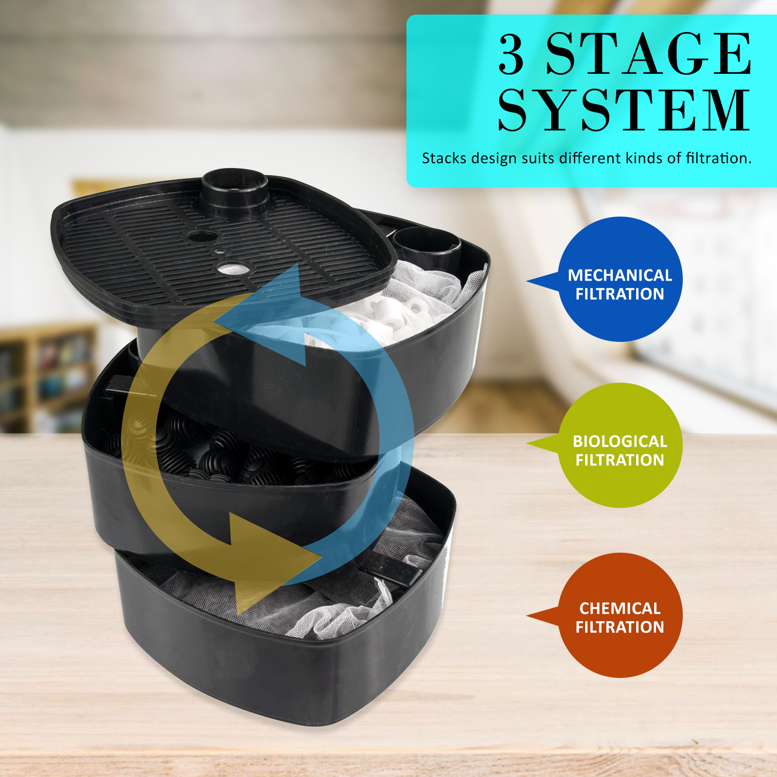 The amazing multi-level filter is capable of offering you the best filtration system as it can hold large quantities of mechanical, biological and chemical filtering materials! The 3 filtration baskets comes with handy handles and allow you to make many different filtering combinations, hence, they give you more flexibility and control over the quality of the water of your tank. The ideal filtering materials are ceramic noodles, bio balls and carbon.