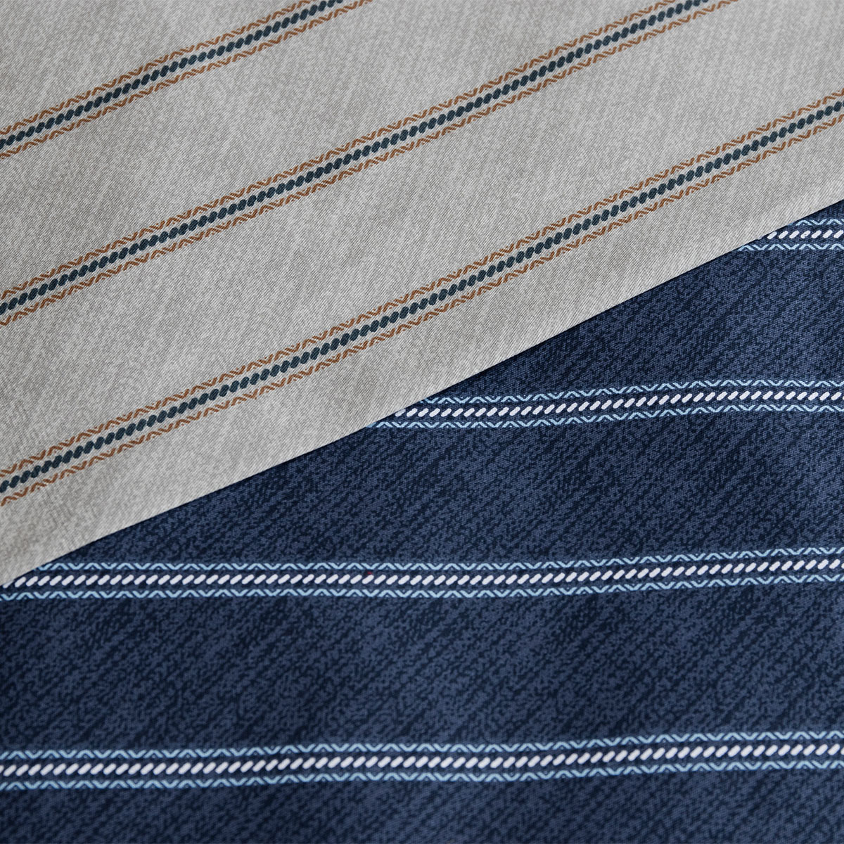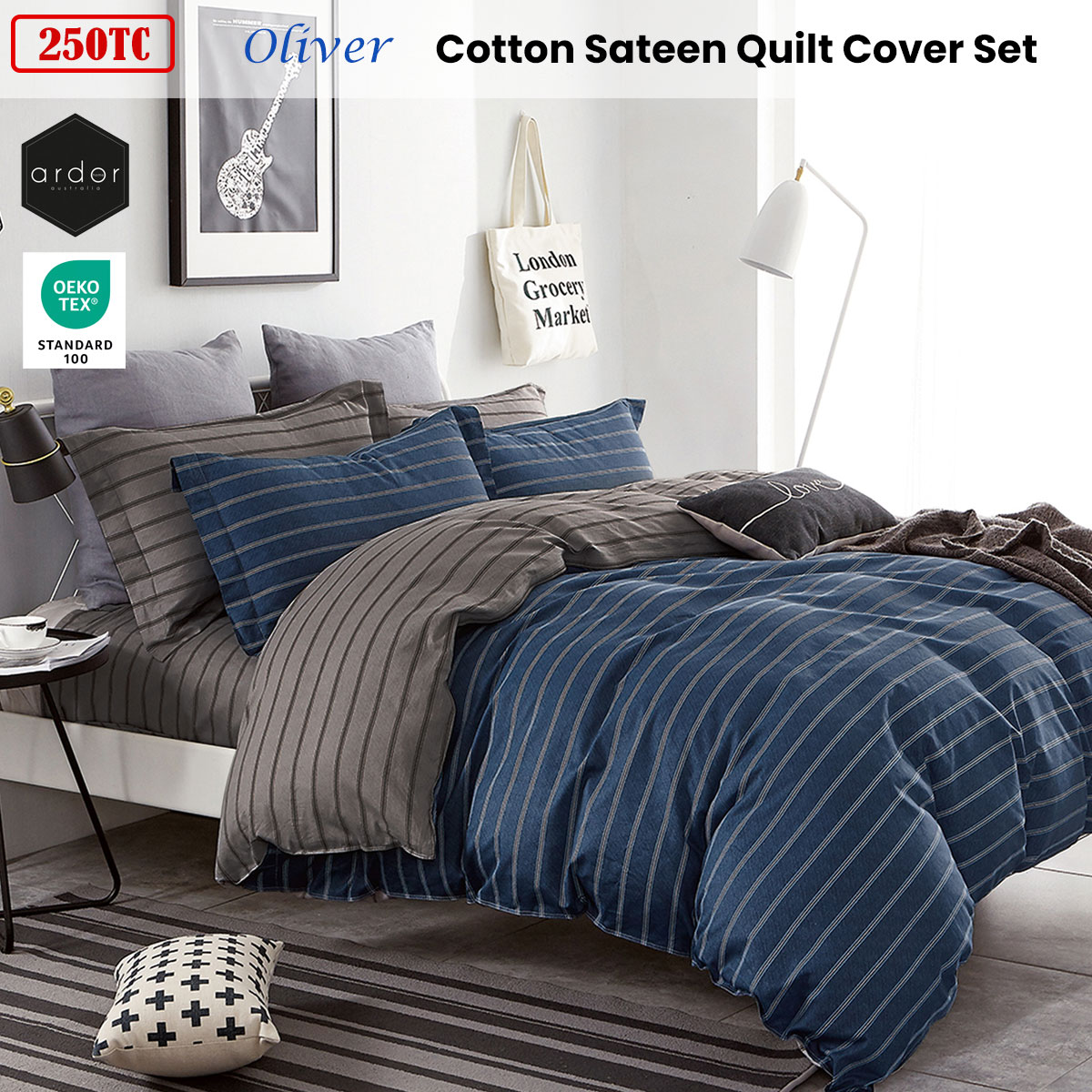 The 250TC Oliver Stripes Cotton Sateen Quilt Cover Set by Ardor in deep navy, white, blue, and charcoal, layers textural grey stripes to create a subtle pattern. This design adds depth and sophistication to your space, with it’s understated textures and soothing grey reverse.