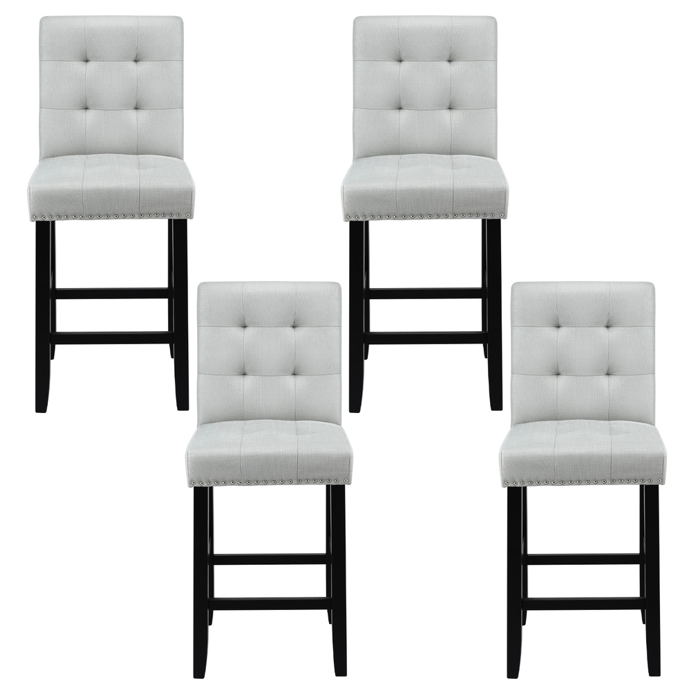 Upgrade your seating with our ergonomic tufted bar stools, perfect for home kitchens, bars, or dining spaces. Each stool boasts a premium faux linen upholstered seat, a decorative silver rivet edge, and a supportive high backrest for unmatched comfort. The thick foam padding ensures a plush seating experience, while the sturdy rubber wood frame delivers reliable strength with a 120kg weight capacity per stool. Anti-slip floor protectors keep your floors scratch-free, and the easy assembly design saves you time. Add elegance and comfort to your space today!
