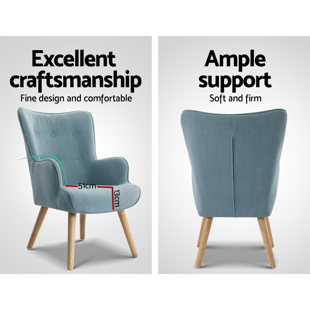 Made with the highest quality craftsmanship, nothing can get you a heavenly comfortable feeling any closer than this. It features a Scandinavian-inspired style that will effortlessly enrich your living room decor. Furthermore, it is available in four gorgeous colours. So style the way you want to achieve the desired look. The armchair is upholstered in premium velvet fabric with a rich high resilience foam padding for comfort, and the tufted design also adds extra elegance. Likewise, the ottoman also shares the same attributes. Not least, the sturdy rubber wood legs are splayed to give this ensemble better support and durability, as well as a unique stance from any angle.