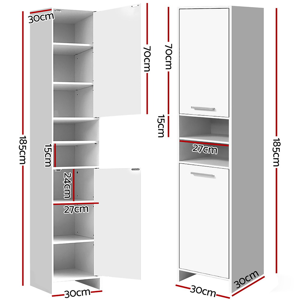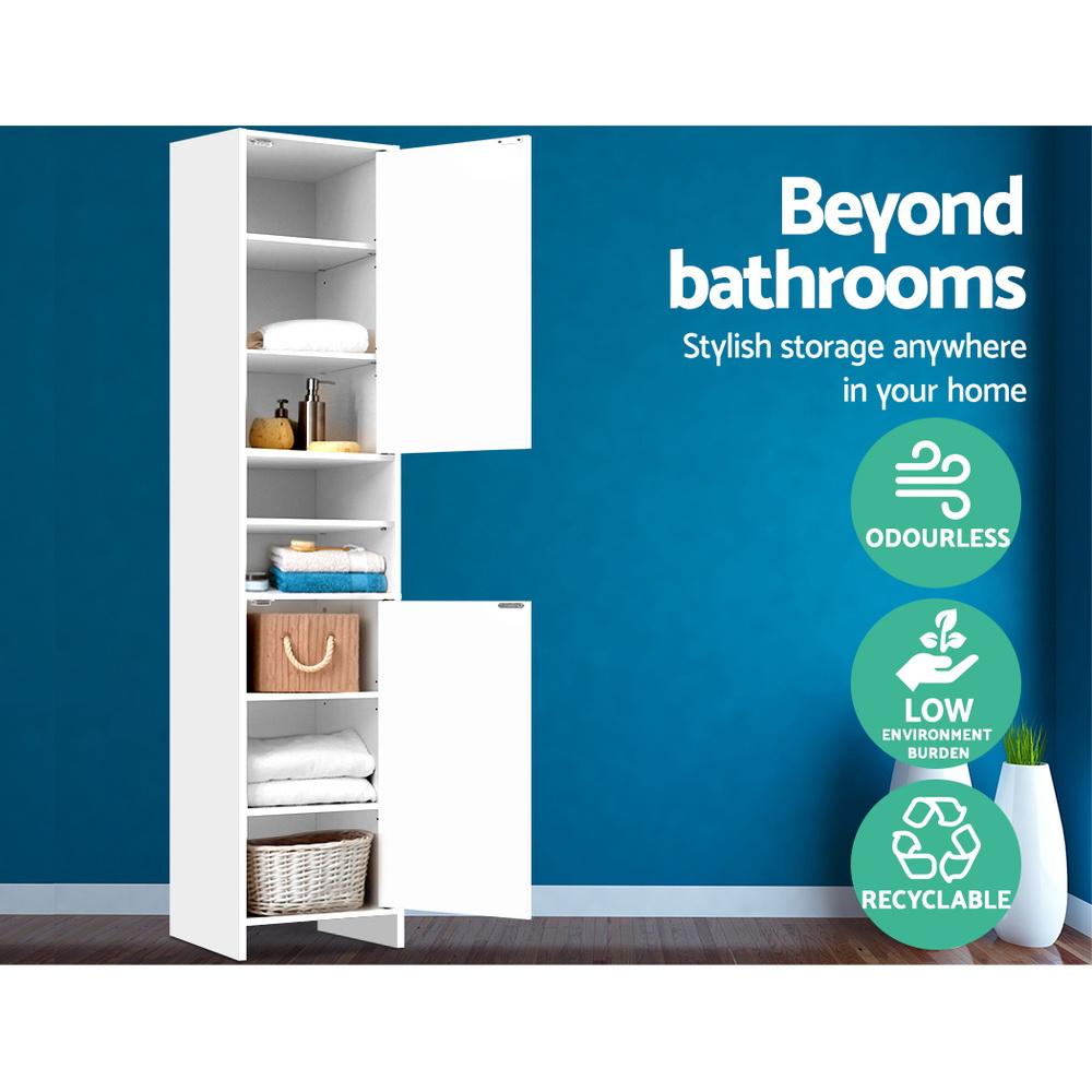 Need more storage but just do not have enough floor space in your home? Our Artiss Tall Cabinet may just be the solution for you. With other storage cabinets that are wider and shorter in shape, you use up more floor space and end up with a lot of wasted wall space that you cannot do much with except hanging family photos. Our tall cabinet has a space-saving design, meaning it only uses up a tiny bit of floor space and can get into all the tricky nooks and crannies. Made of eco-friendly engineered wood with melamine finish, the cabinet features sturdy construction and eight tiers of storage. With two open shelves and two large closed cabinets with magnetic door catches, the cabinet provides more than ample space for all your bathroom or living room essentials despite its small footprint.