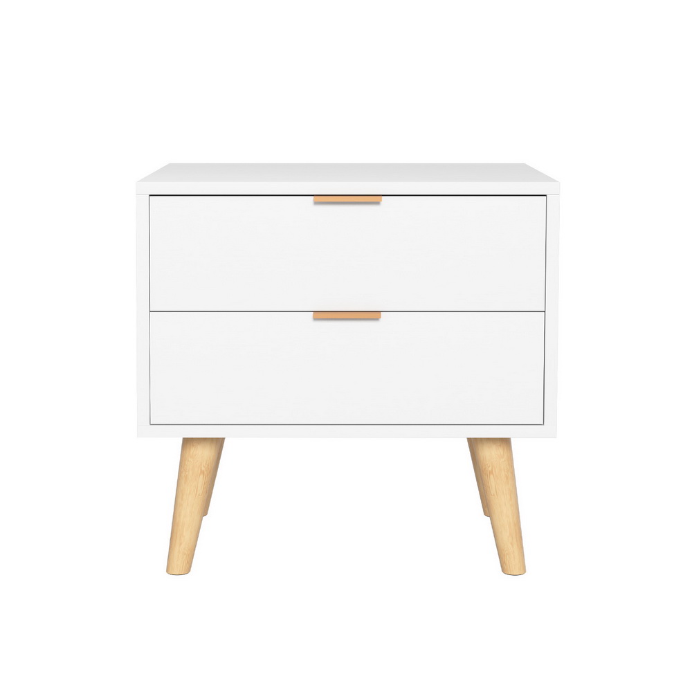 Crafted from durable particle board, this Artiss bedside table boasts ample storage with two spacious drawers, adorned with sleek aluminium handles. Supported by sturdy pine wood legs, it’s easy to assemble and maintain, complete with floor protectors.