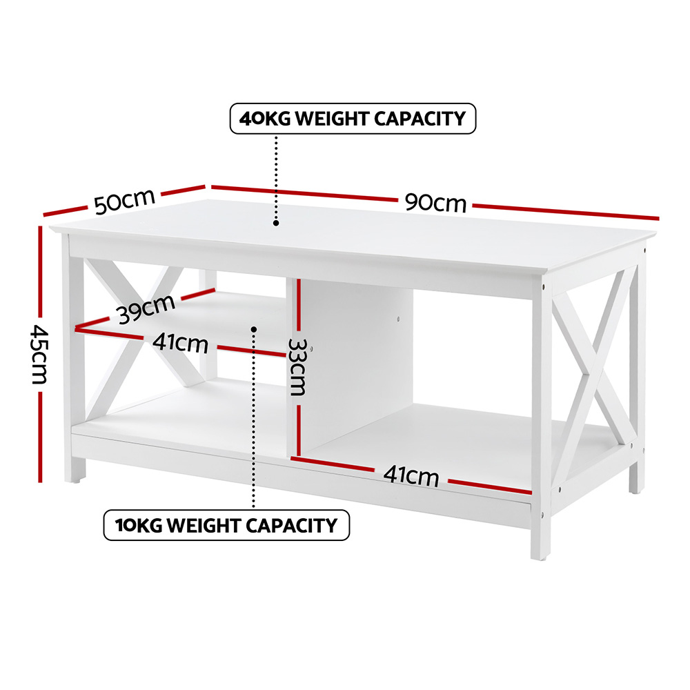 Bring coastal charm to your living space with the Artiss 3-Tier Coffee Table, combining functional storage with sleek modern design. The robust X-shaped legs wrapped in melamine veneer provides industrial-strength support, while spacious open shelves offer flexible display options for decor pieces. Featuring smooth edges and floor protectors, this versatile centerpiece transitions effortlessly from beach house lounges to urban apartments. The stain-resistant surface wipes clean with a damp cloth, maintaining its fresh white aesthetic through years of daily use.
