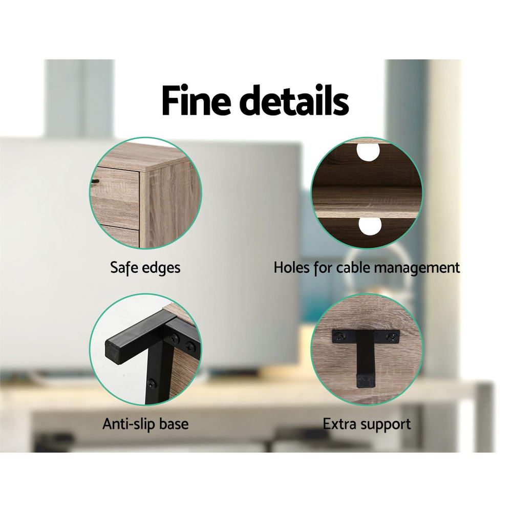 Your treasured home entertainment system deserves the best cabinet for it. And that is why our Artiss Tania Entertainment Unit is the ideal choice for you. Incorporating a contemporary industrial-look design and presented with 15mm thick particle board with durable powder-coated steel that provides an eclectic touch, our entertainment unit displays great craftsmanship with equally fine hardware to ensure trouble-free use every time. There is even an extra supporting leg attached to the base for a steady and firm stand at all times. And it offers ample storage space with two open shelves and one deep cabinet with a magnetic door catch and two spacious drawers with anti-rust runners for all your entertainment essentials. Better still, the ensemble features black metal handles for a sleek yet industrial appearance and a pre-drilled hole to keep all your cables tidy.