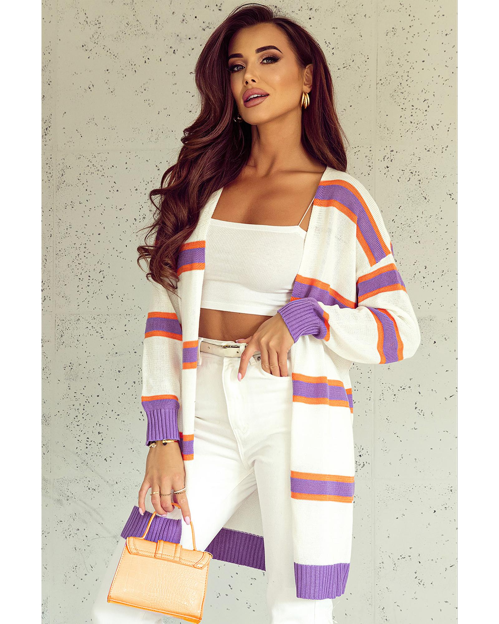 Azura Exchange Beige Striped Long Sleeve Ribbed Trim Button Cardigan – S