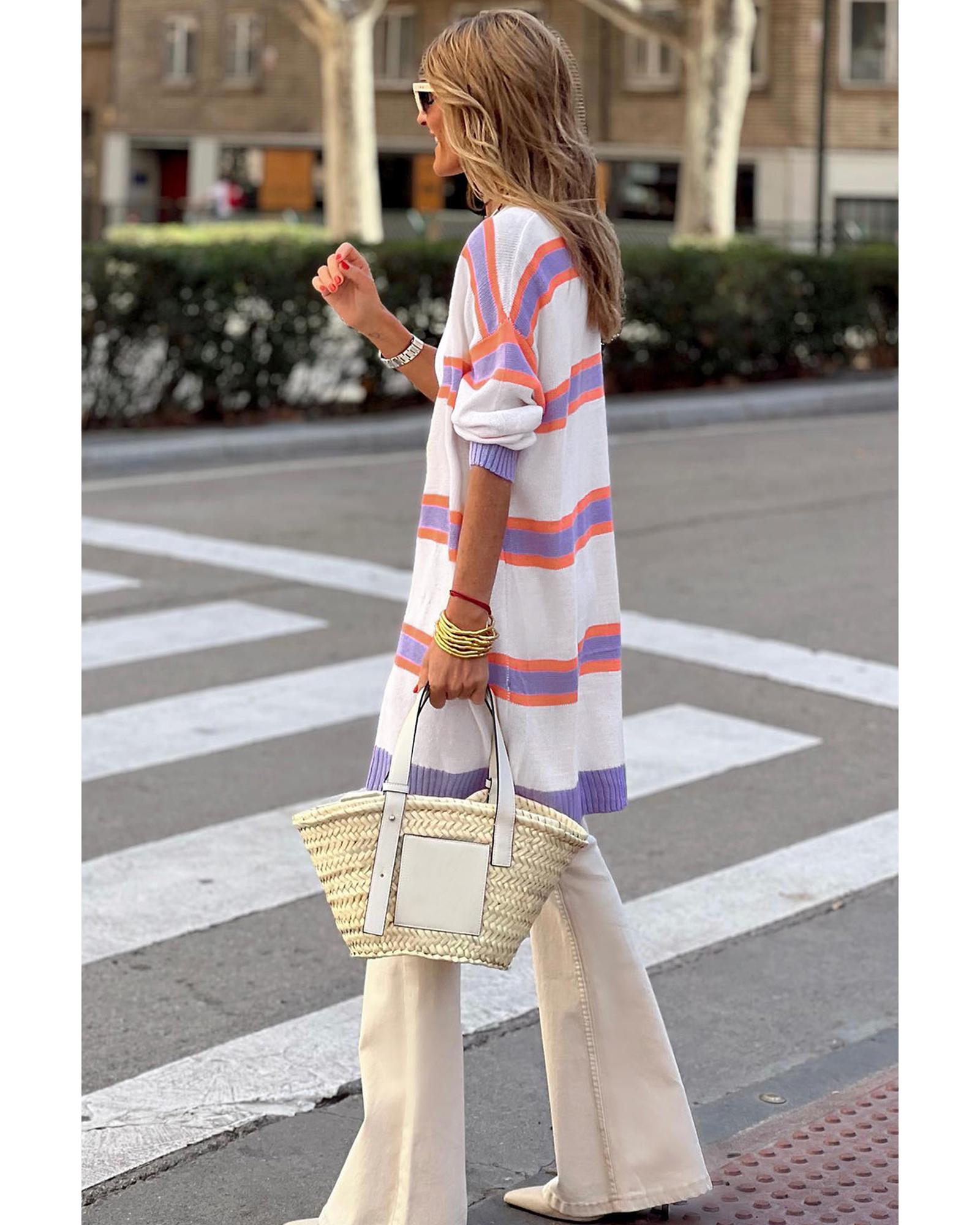Azura Exchange Beige Striped Long Sleeve Ribbed Trim Button Cardigan – XL