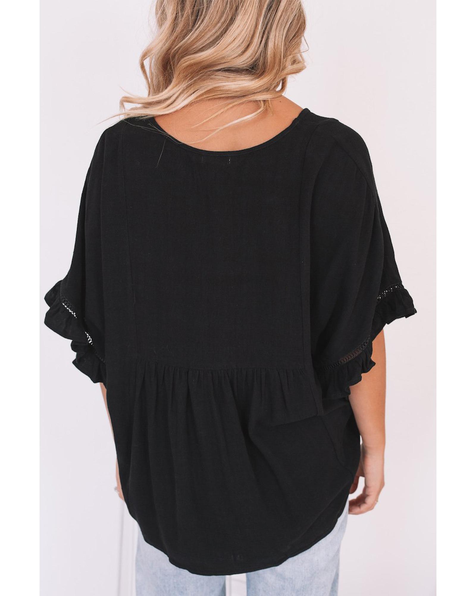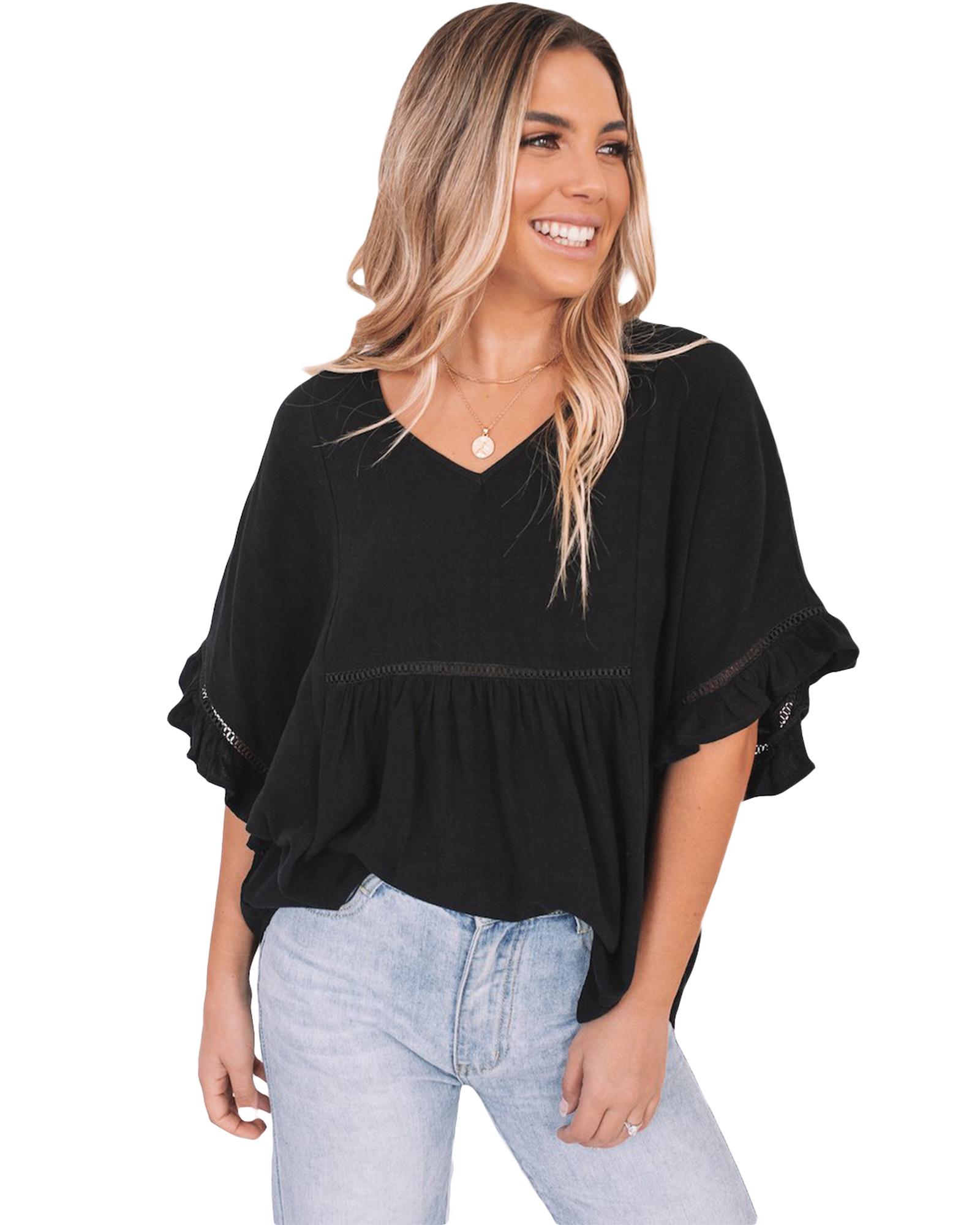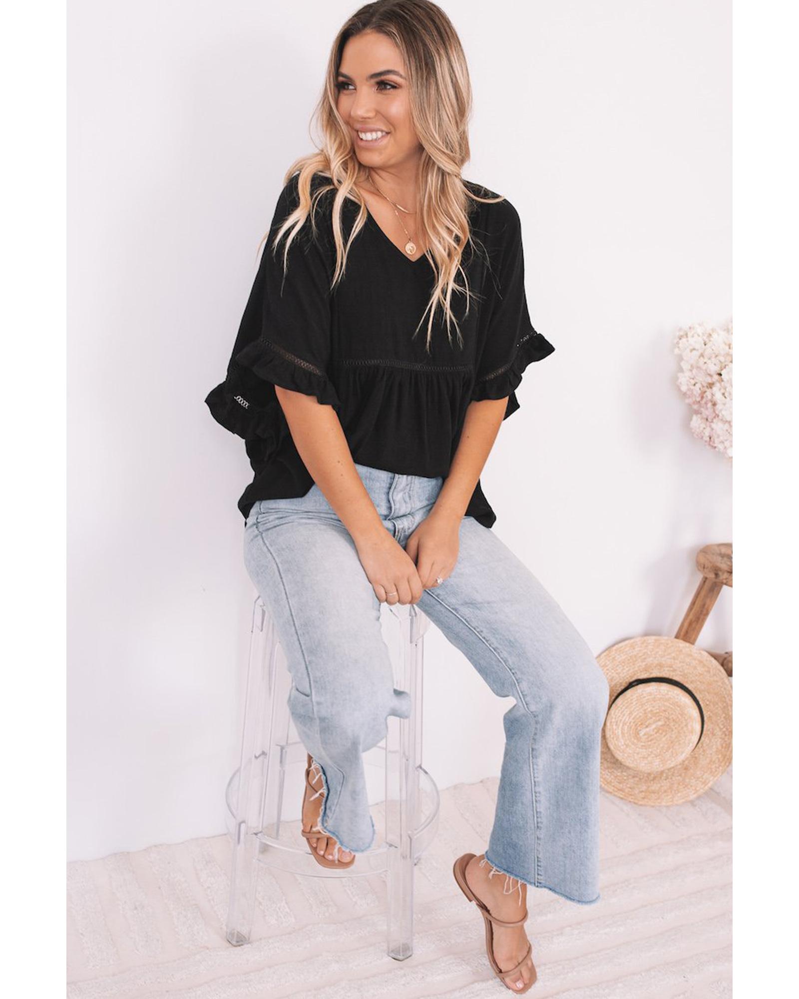 Azura Exchange Black Ruffled Lace Detail Loose V Neck Top – L
