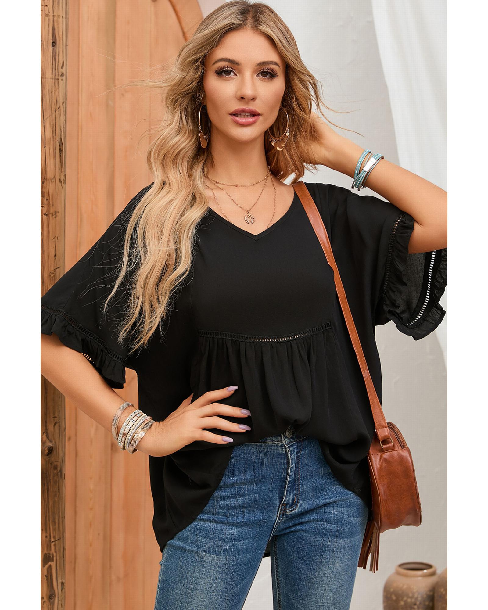 Azura Exchange Black Ruffled Lace Detail Loose V Neck Top – M