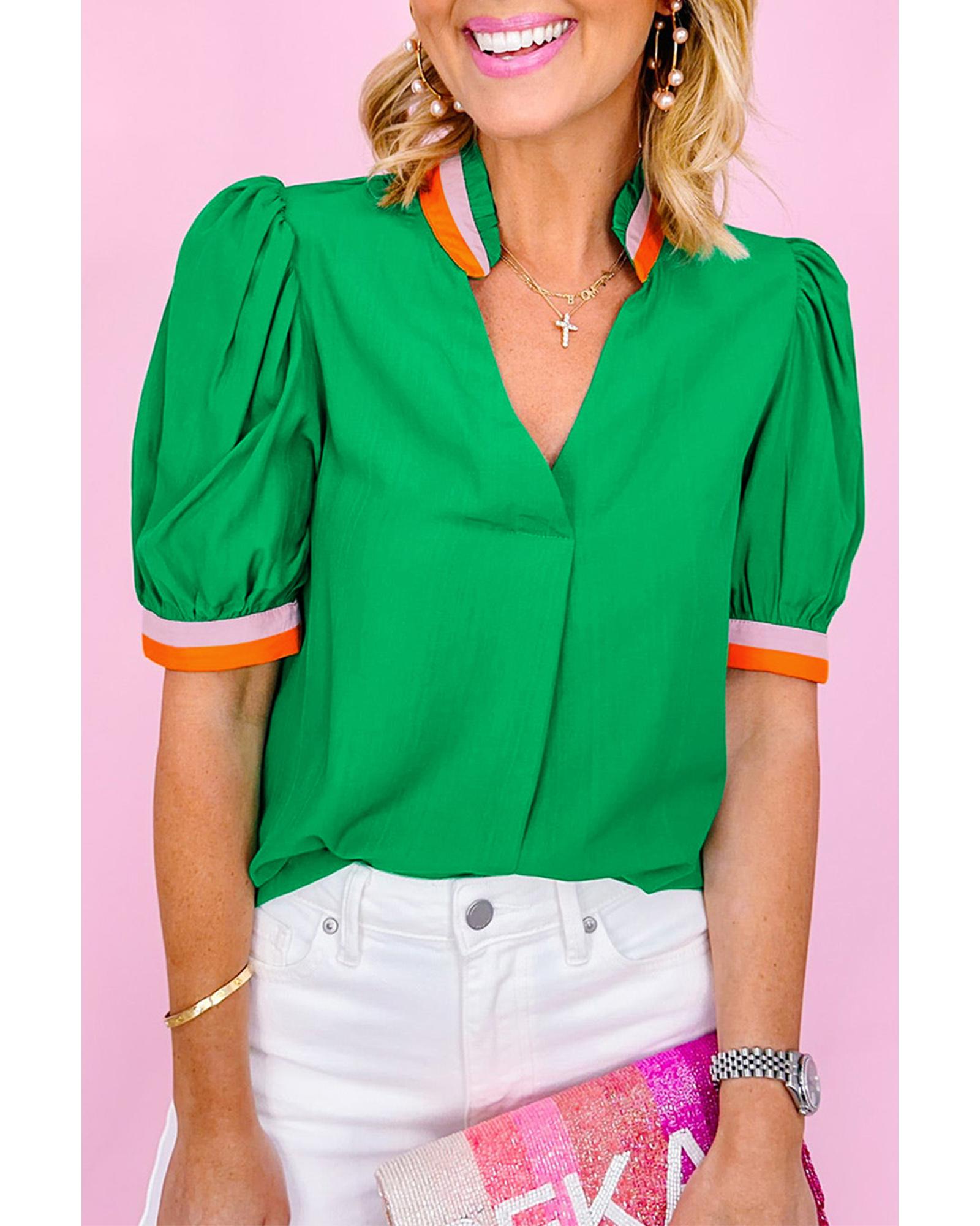 Azura Exchange Bright Green Colorful Trim V Neck Short Sleeve Blouse – S