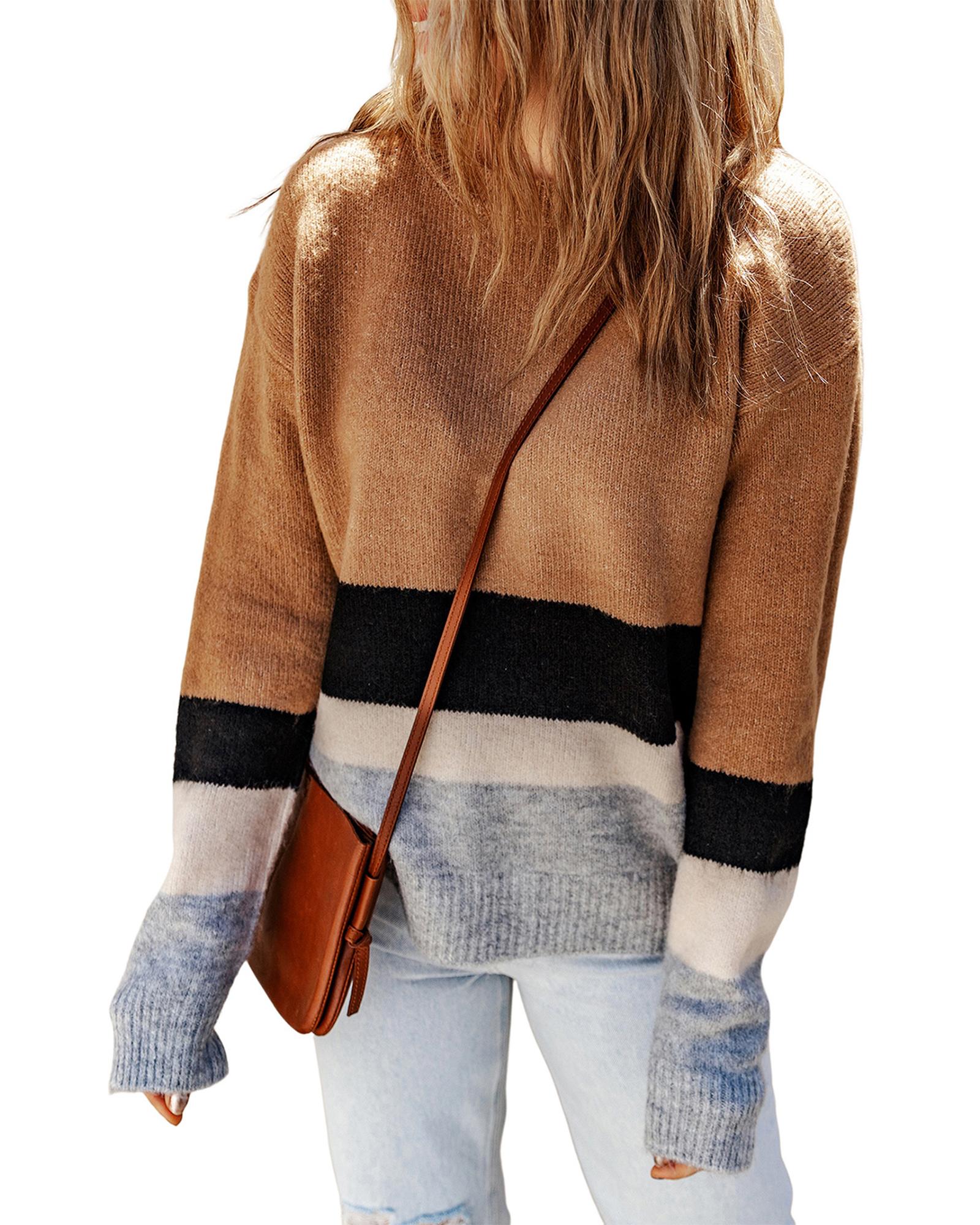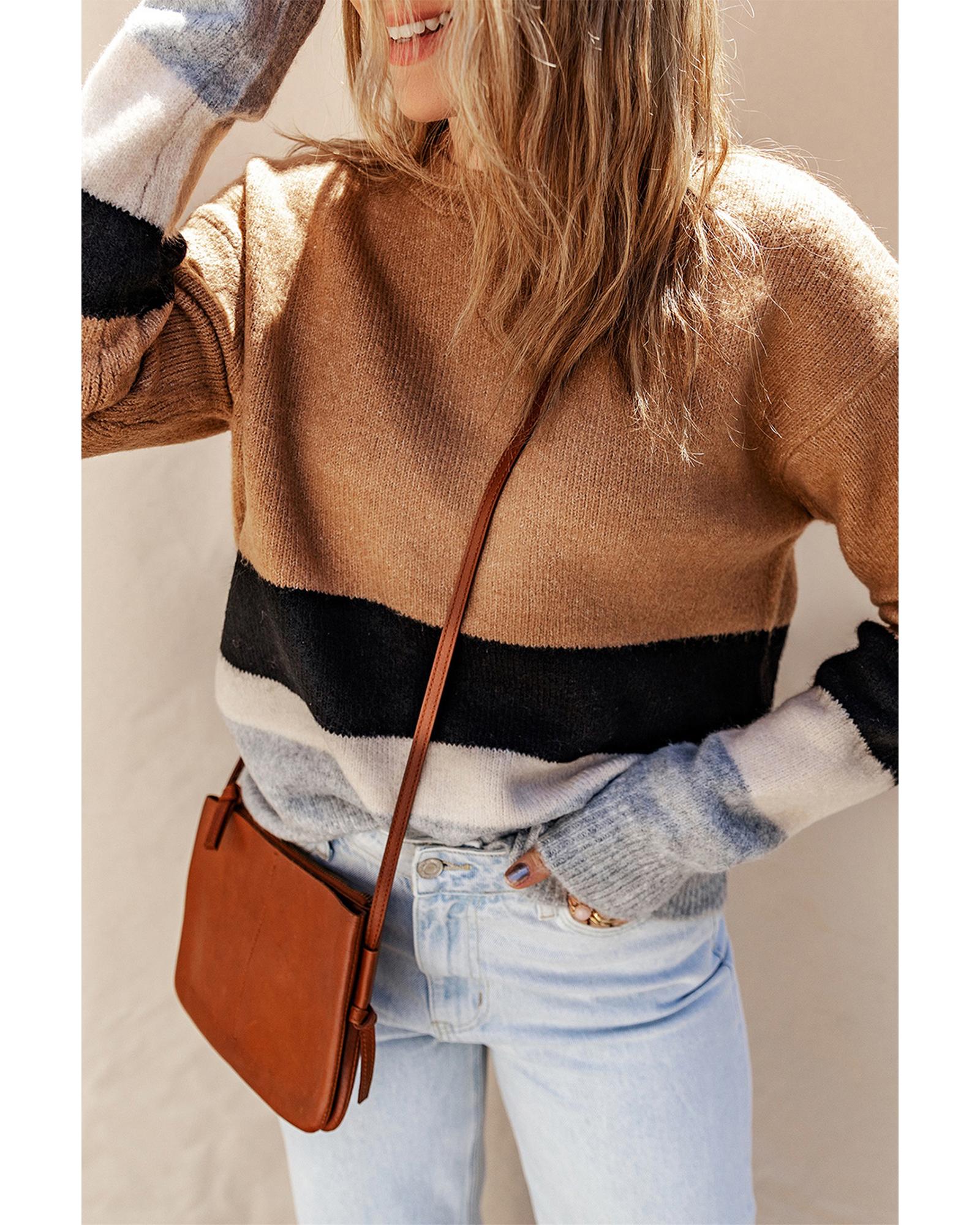 Azura Exchange Brown Color Block Striped Ribbed Knit Sweater – M