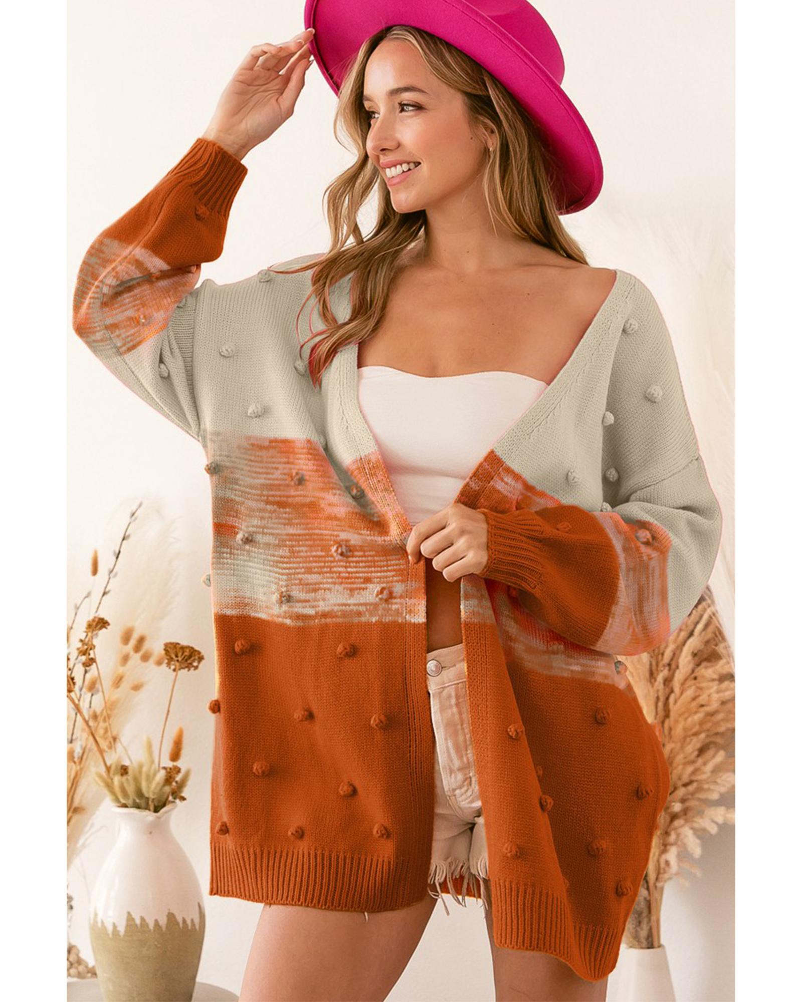 Azura Exchange Brown Pompom Color Block Open Front Cardigan – M