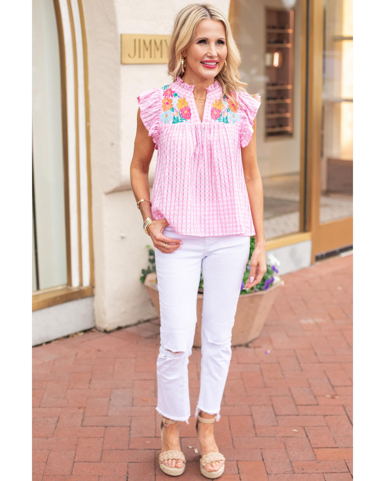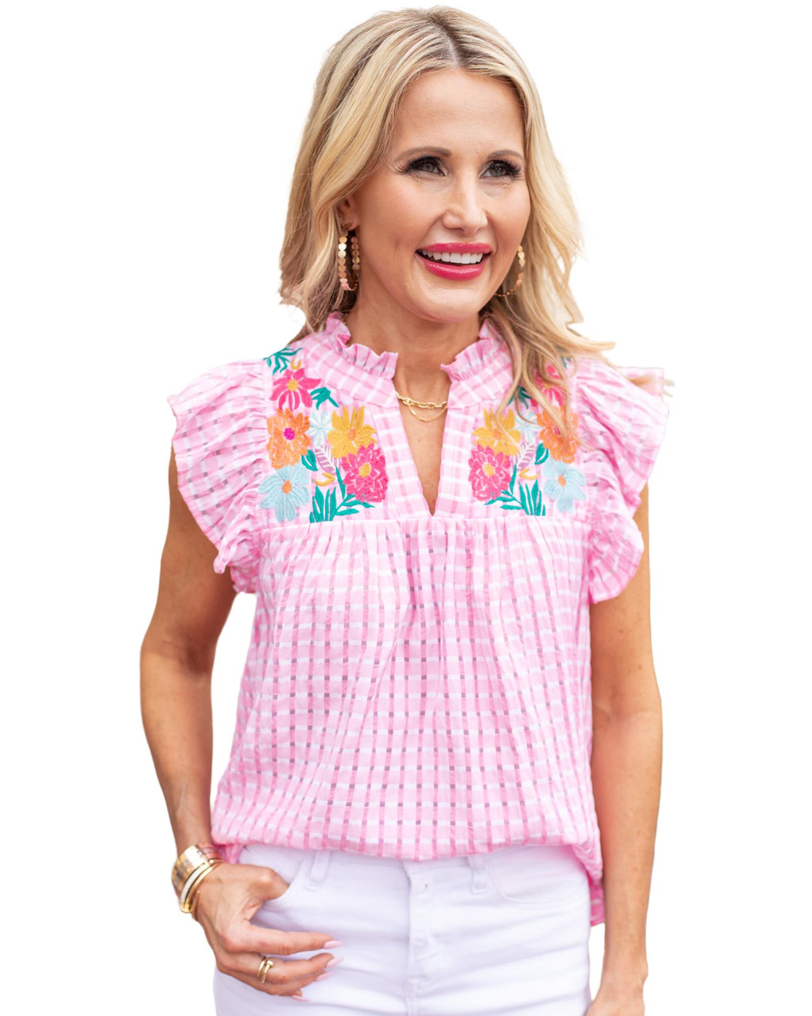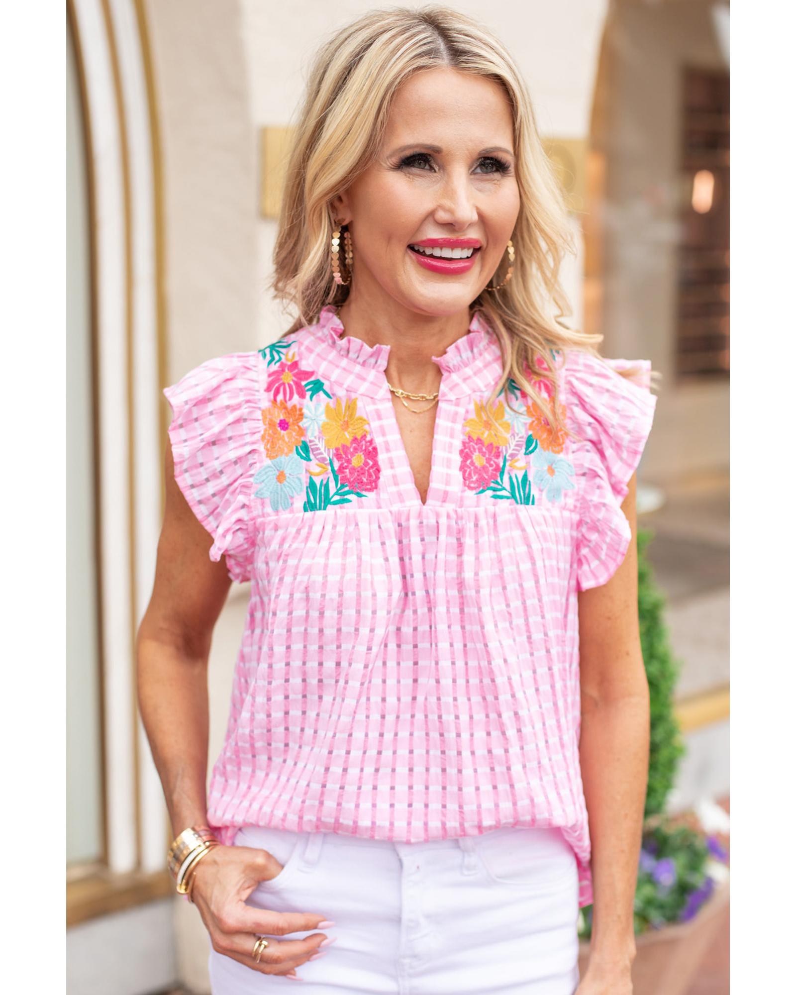 Azura Exchange Check Ruffle Sleeves Blouse with Floral Embroidery – L