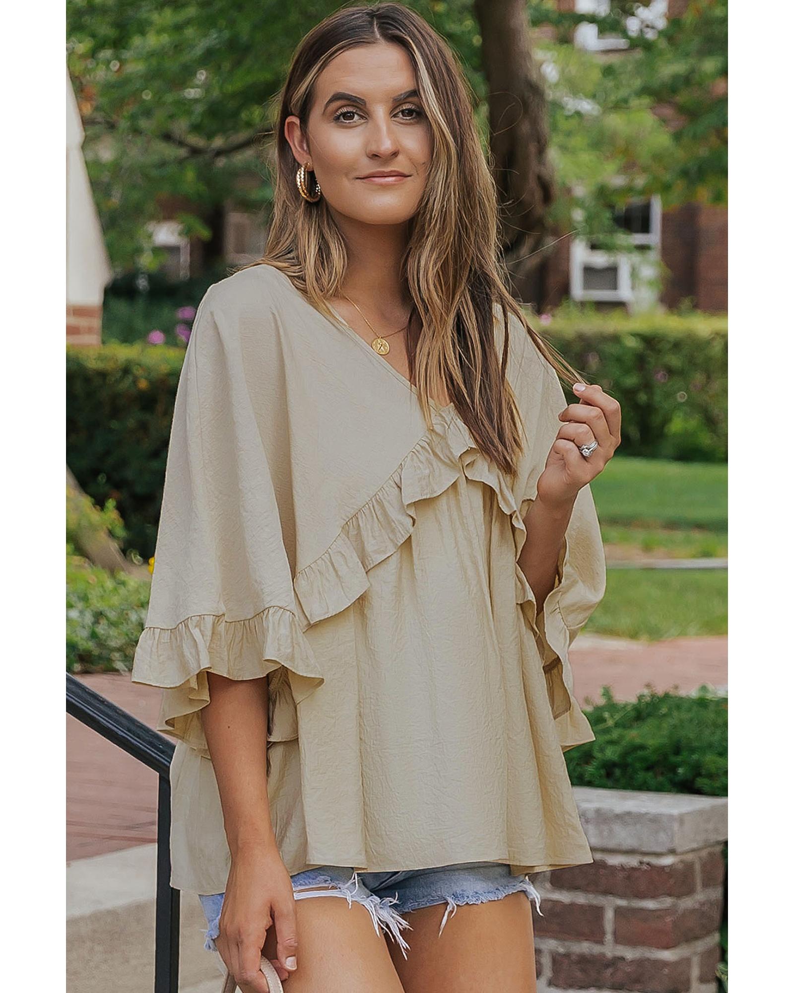 • Stylish and elegant V Neck Draped Batwing Sleeve Ruffle Top
