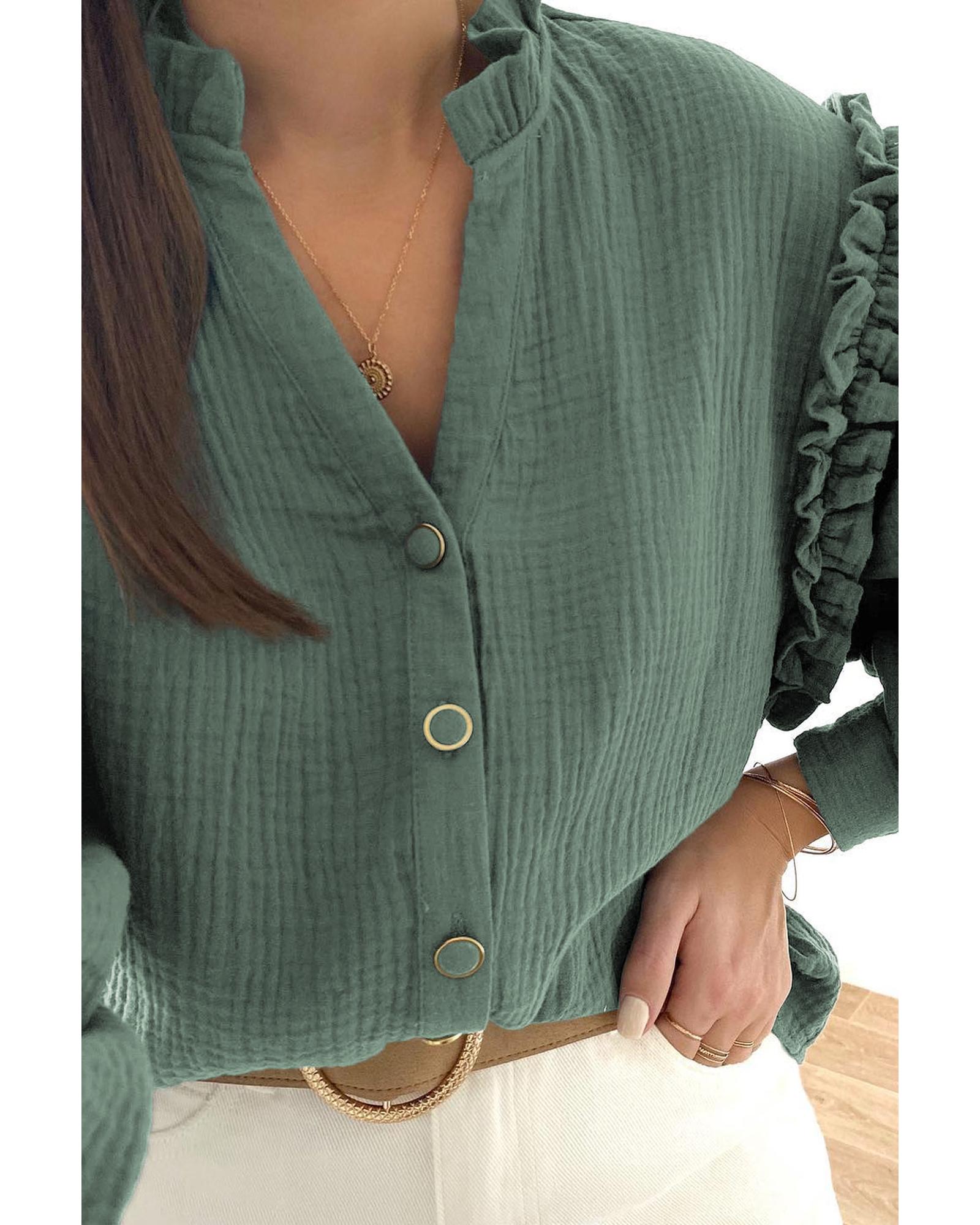 - Green Frilled Split Neck Crinkled Shirt