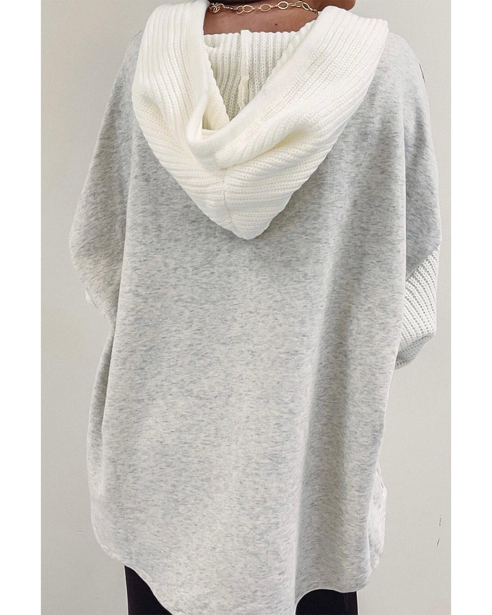 • Stay cozy and stylish with our Gray Button Up Contrast Knitted Sleeves Hooded Jacket