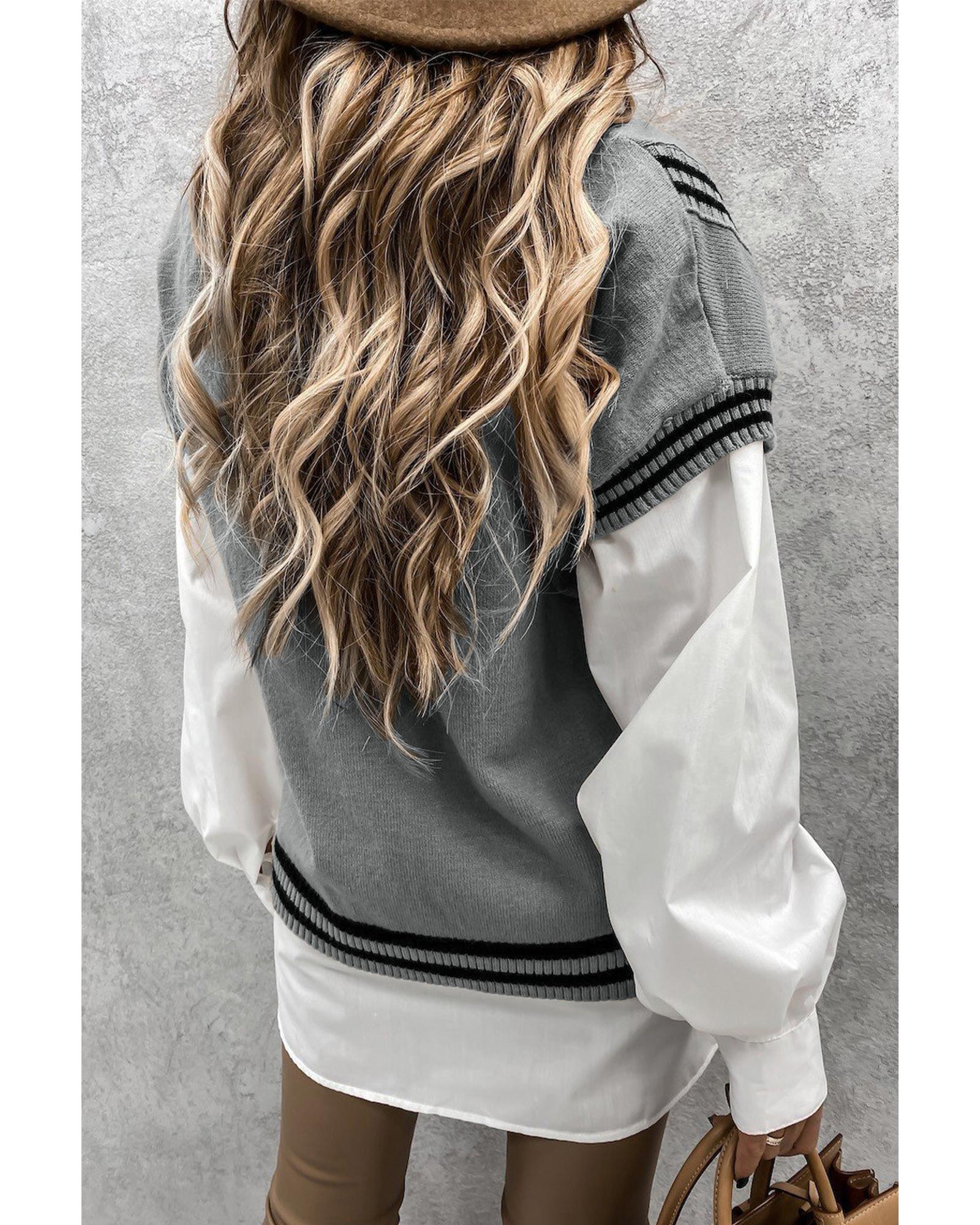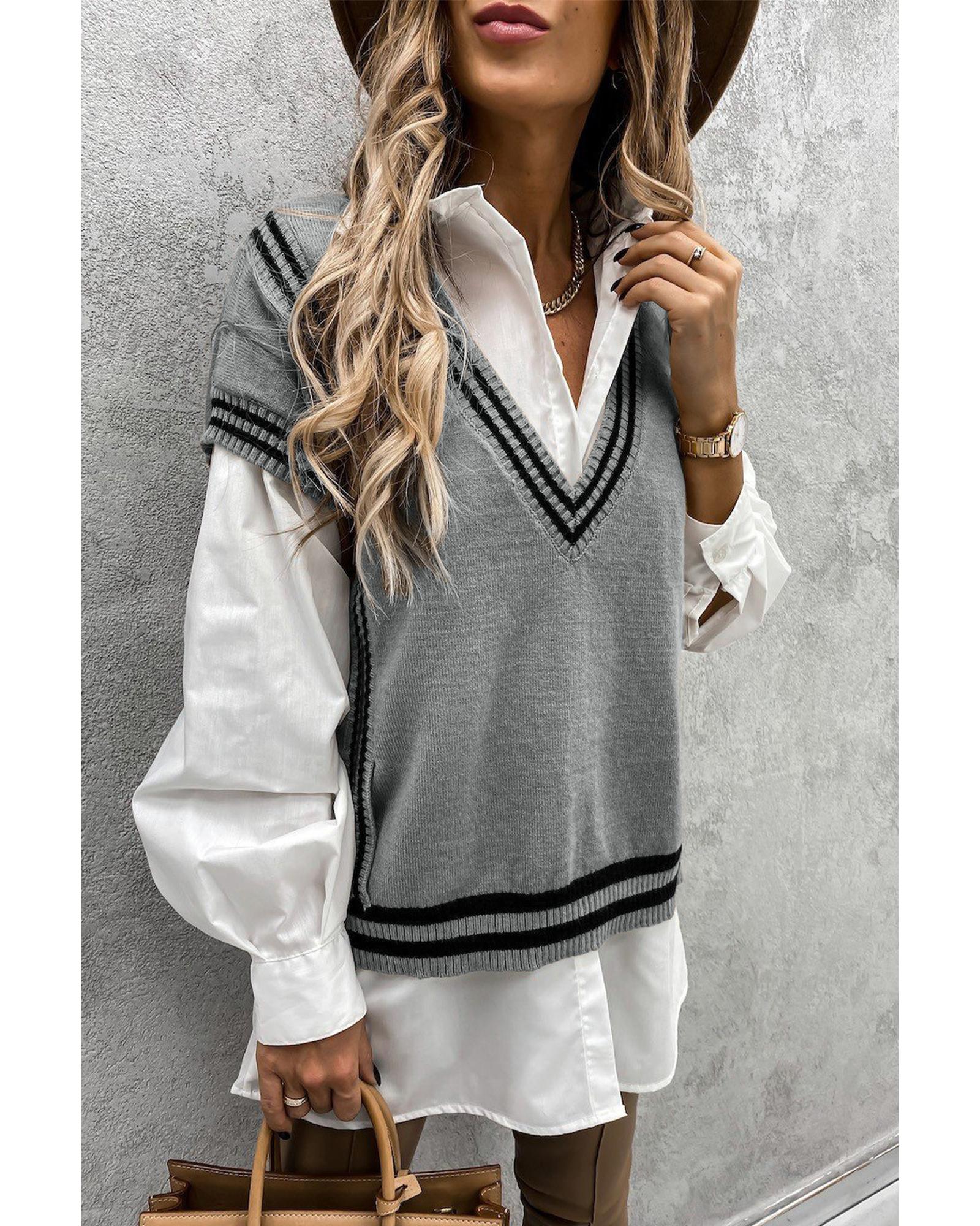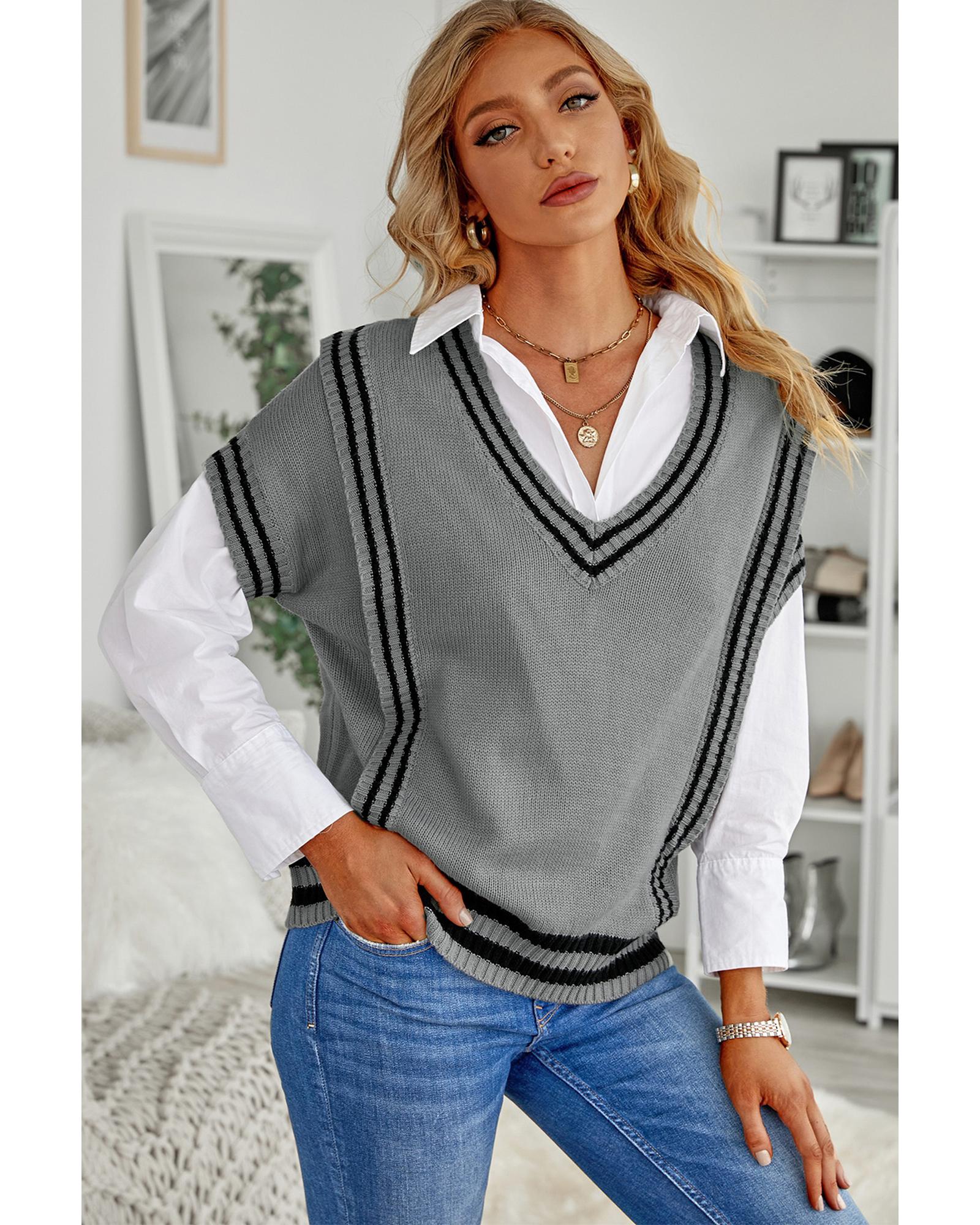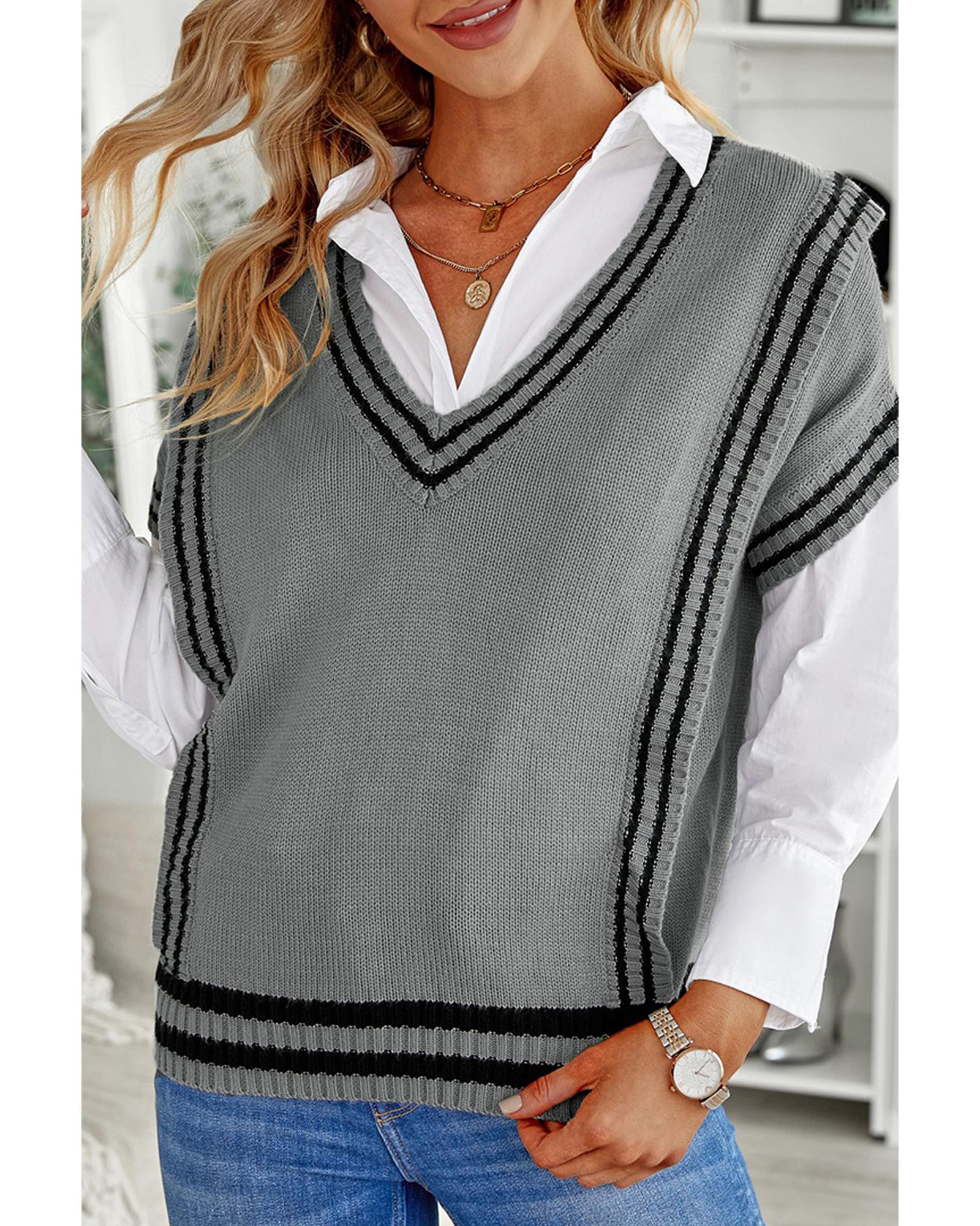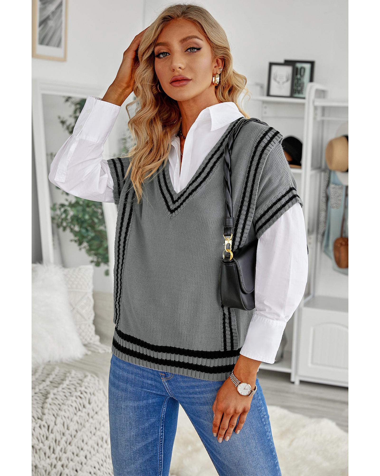 Azura Exchange Gray V Neck Contrast Stripes Trims Short Sleeve Sweater – M