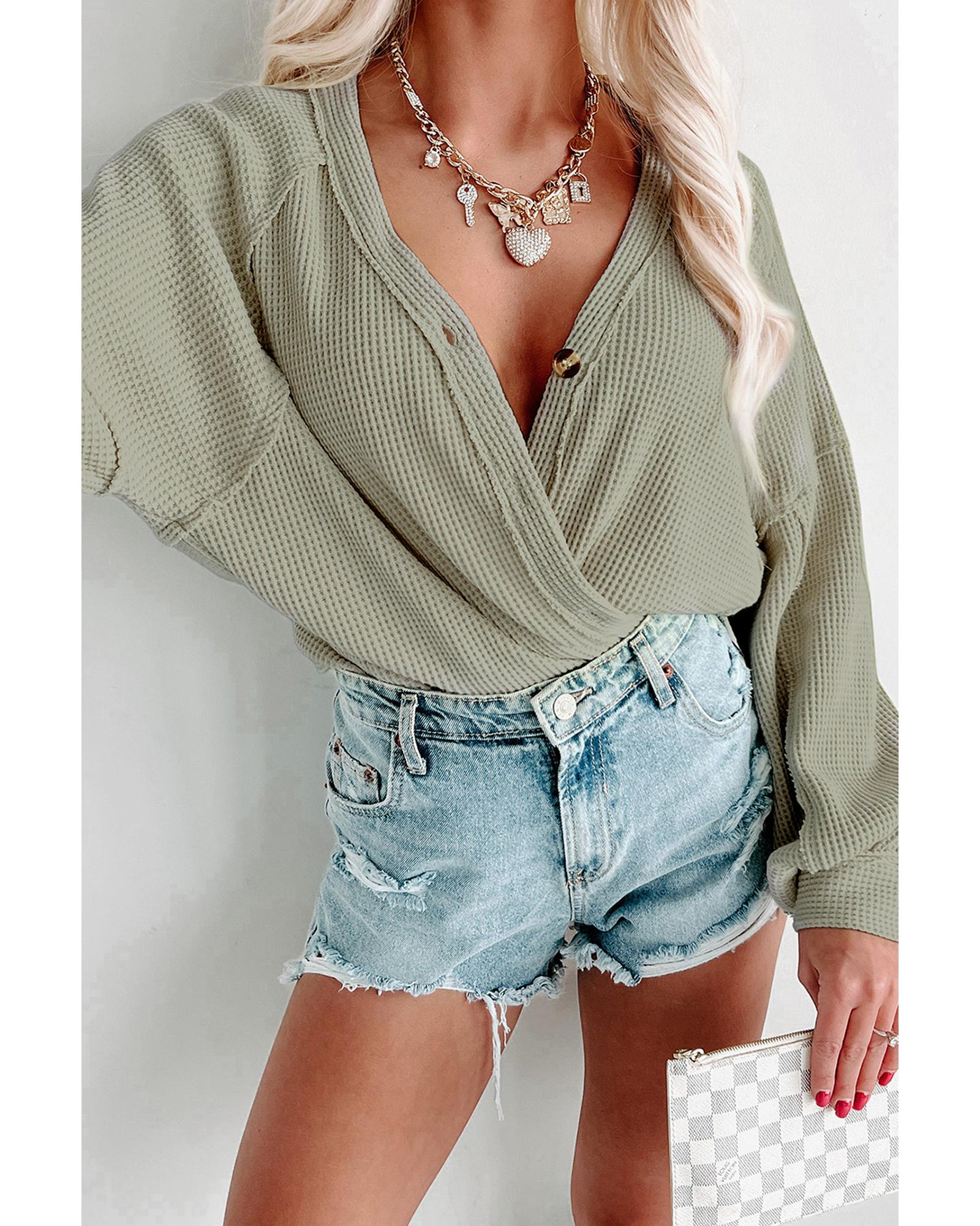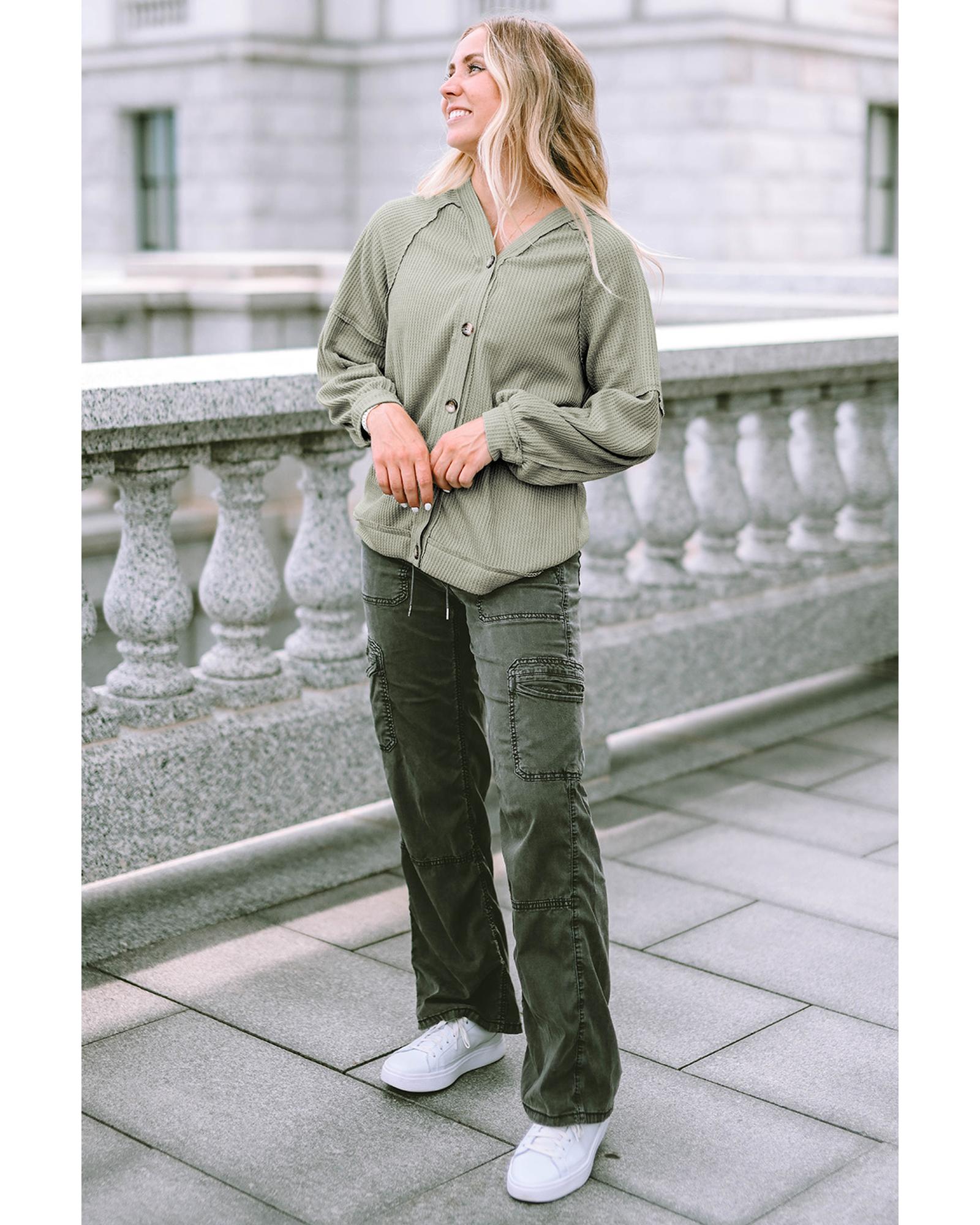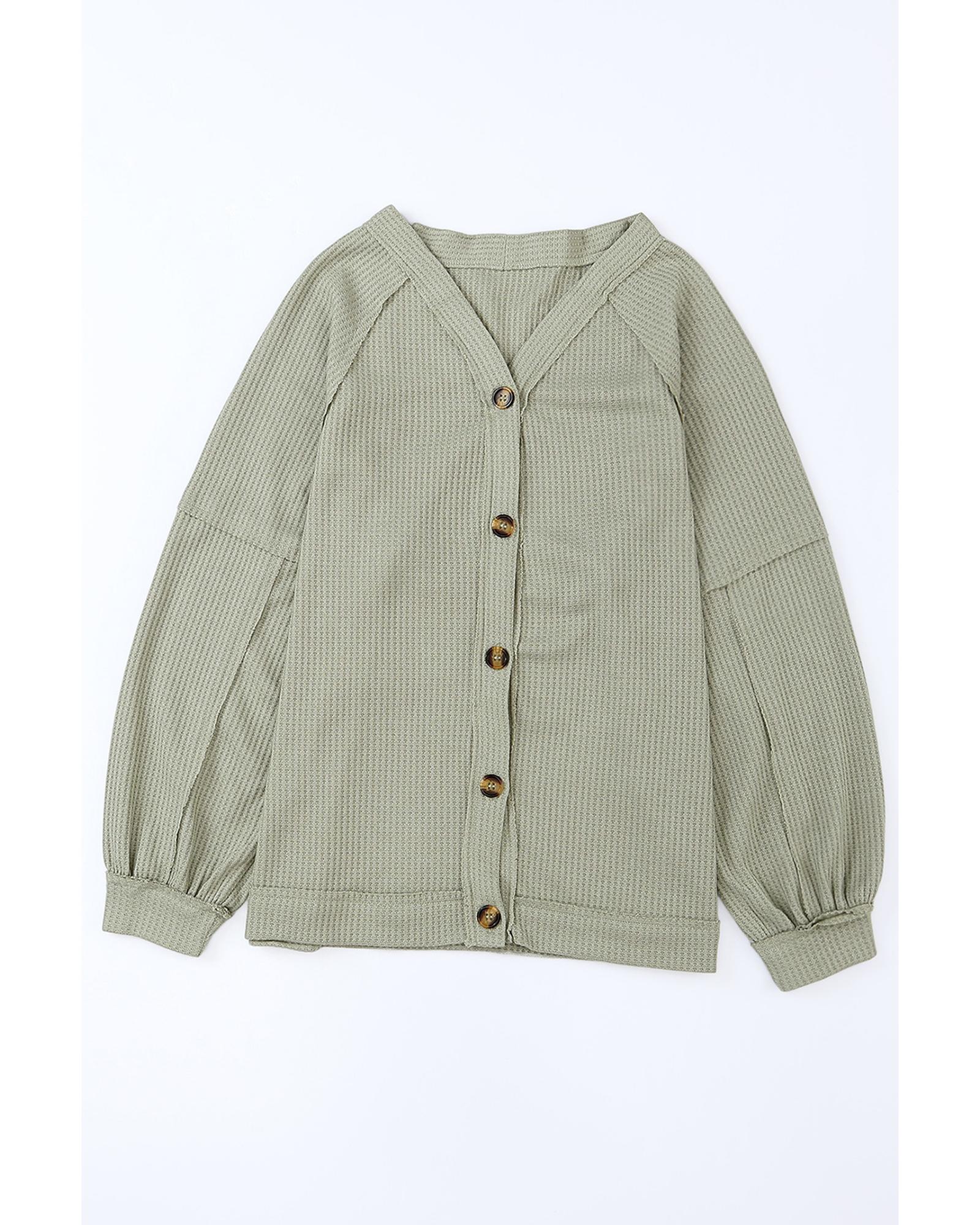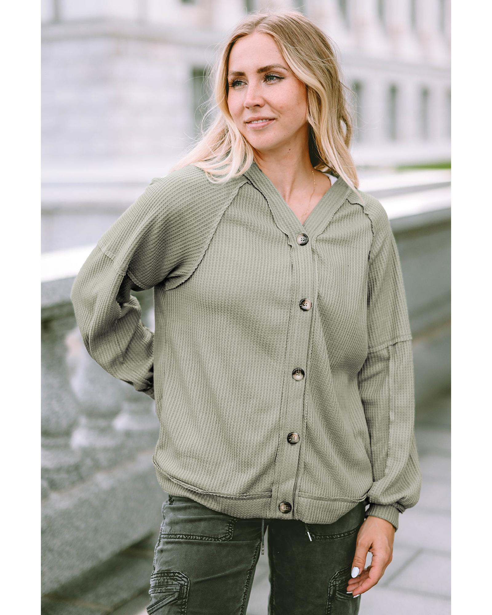- Green Exposed Seam Buttons Front Waffle Knit Cardigan