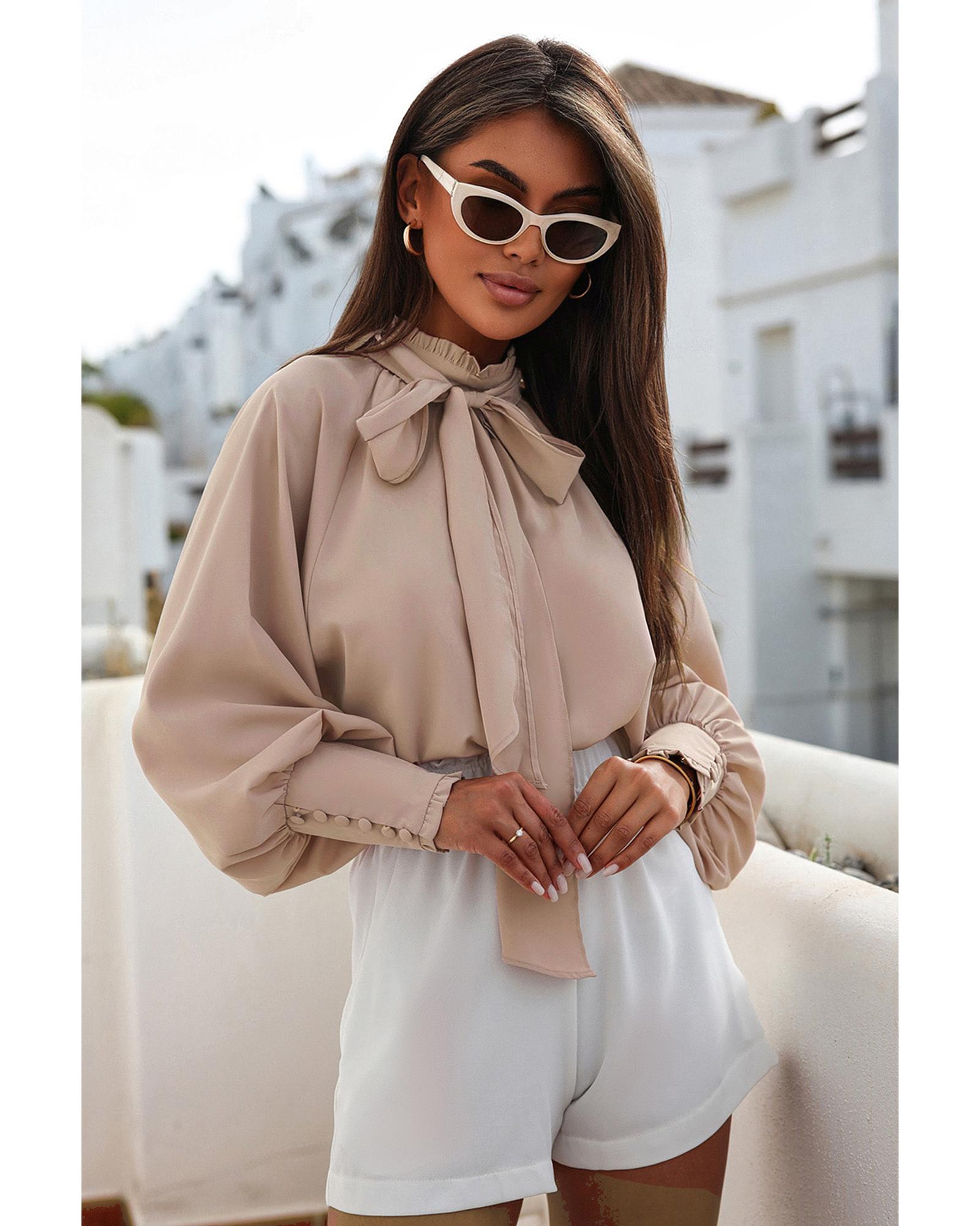 Azura Exchange Khaki Frilled Knotted Blouse with Bishop Sleeves – M