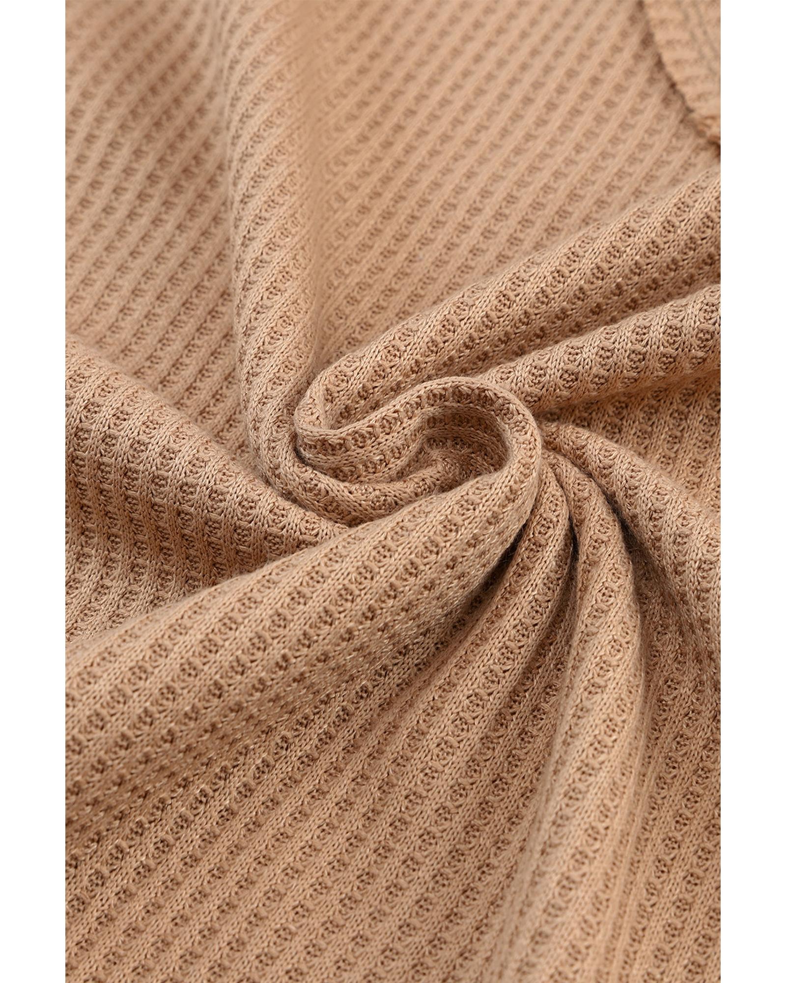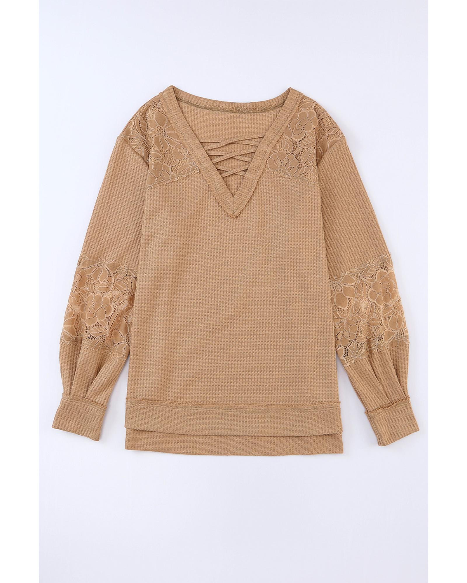 Azura Exchange Lace Waffle Patchwork Strappy V Neck Long Sleeve Top – S