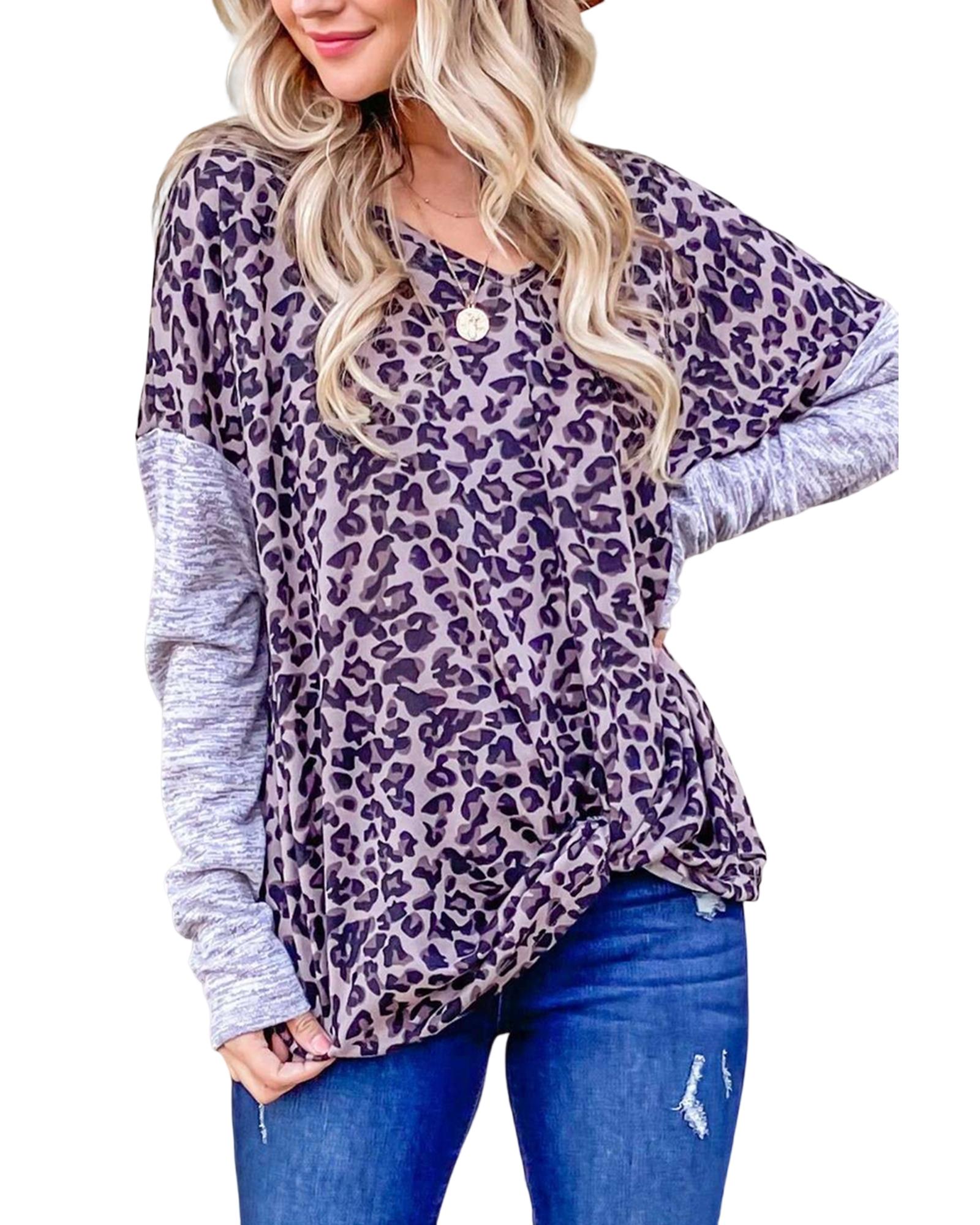- Stylish and trendy Leopard Print Drop Shoulder Patchwork Sleeve Top