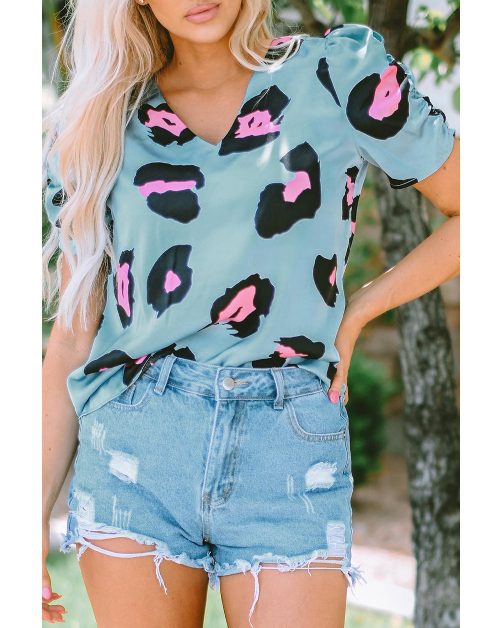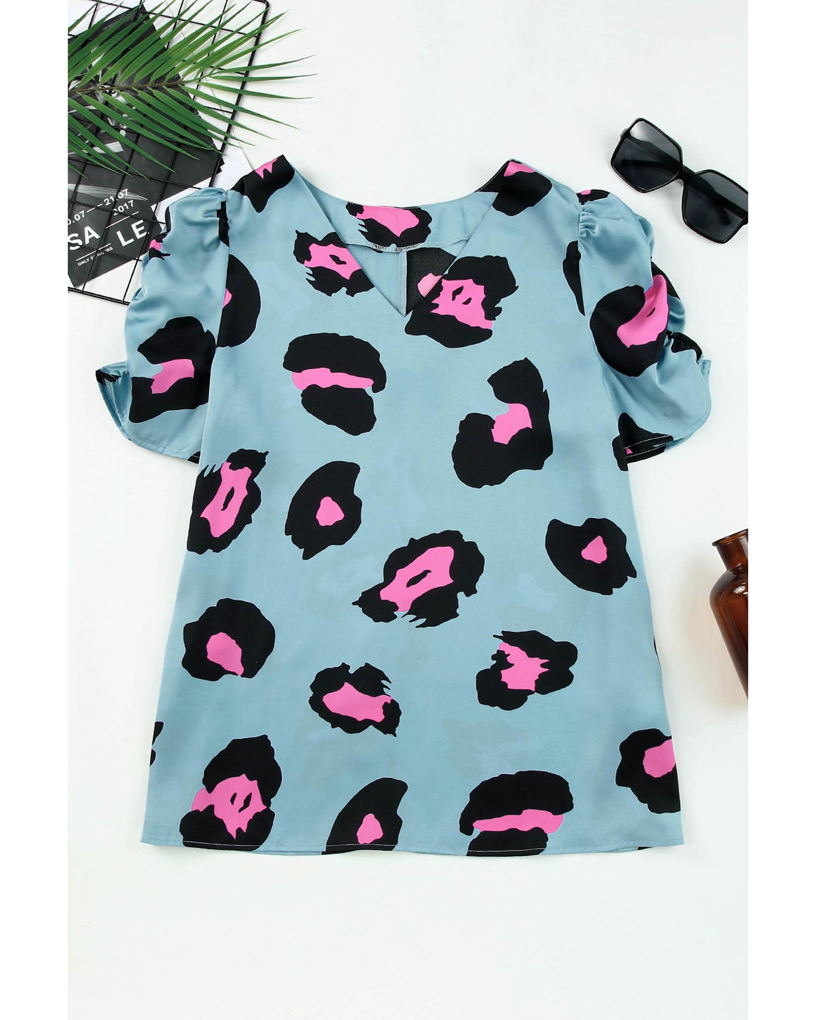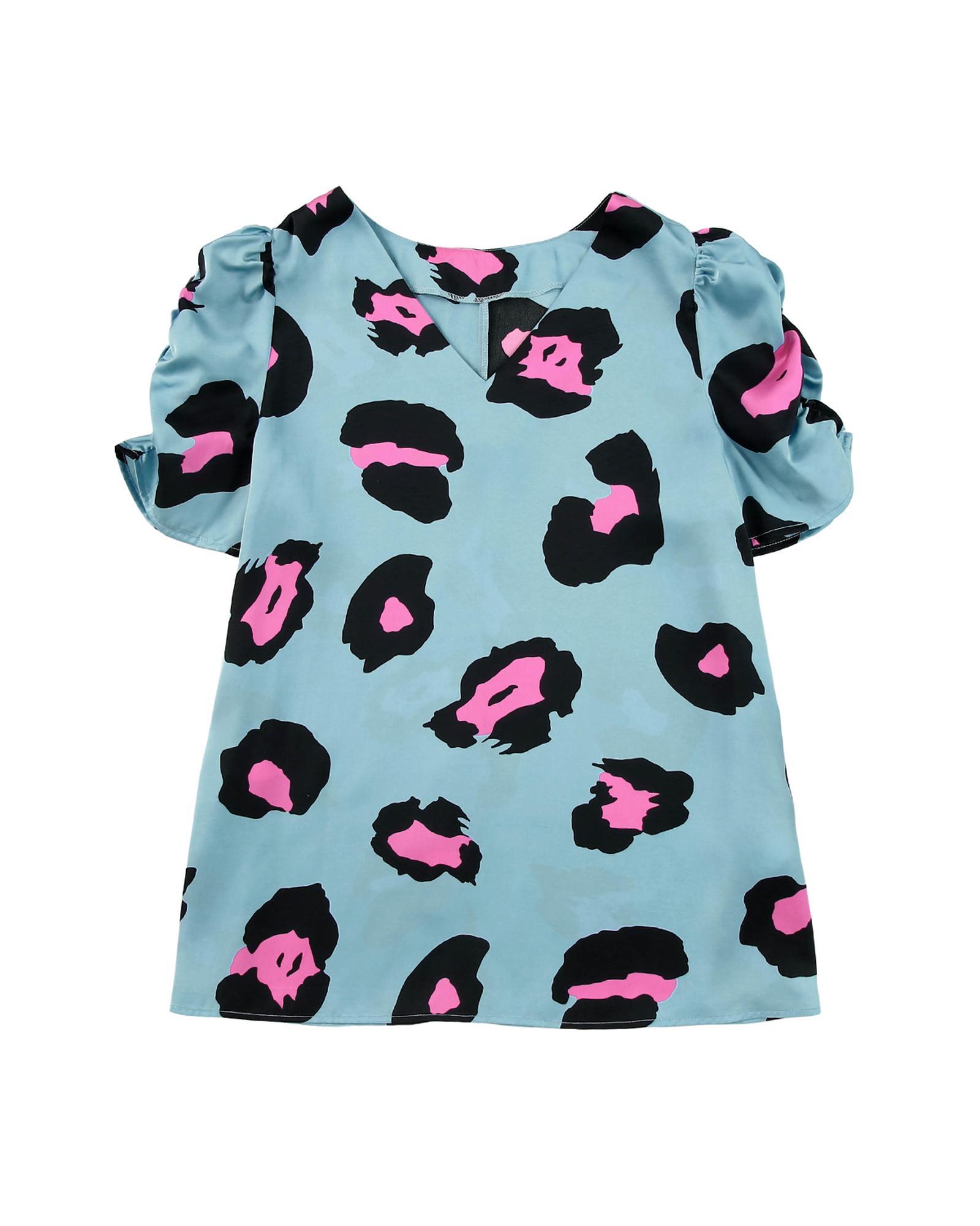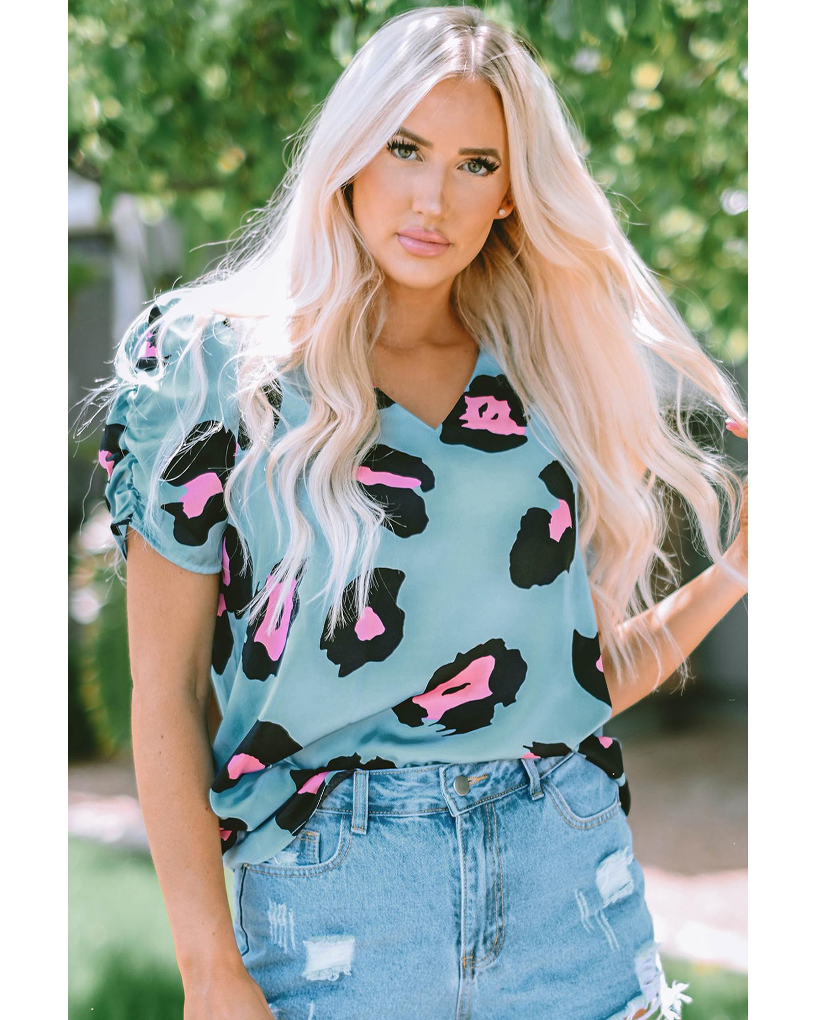 Azura Exchange Leopard Print Ruched Short Sleeve Blouse – S