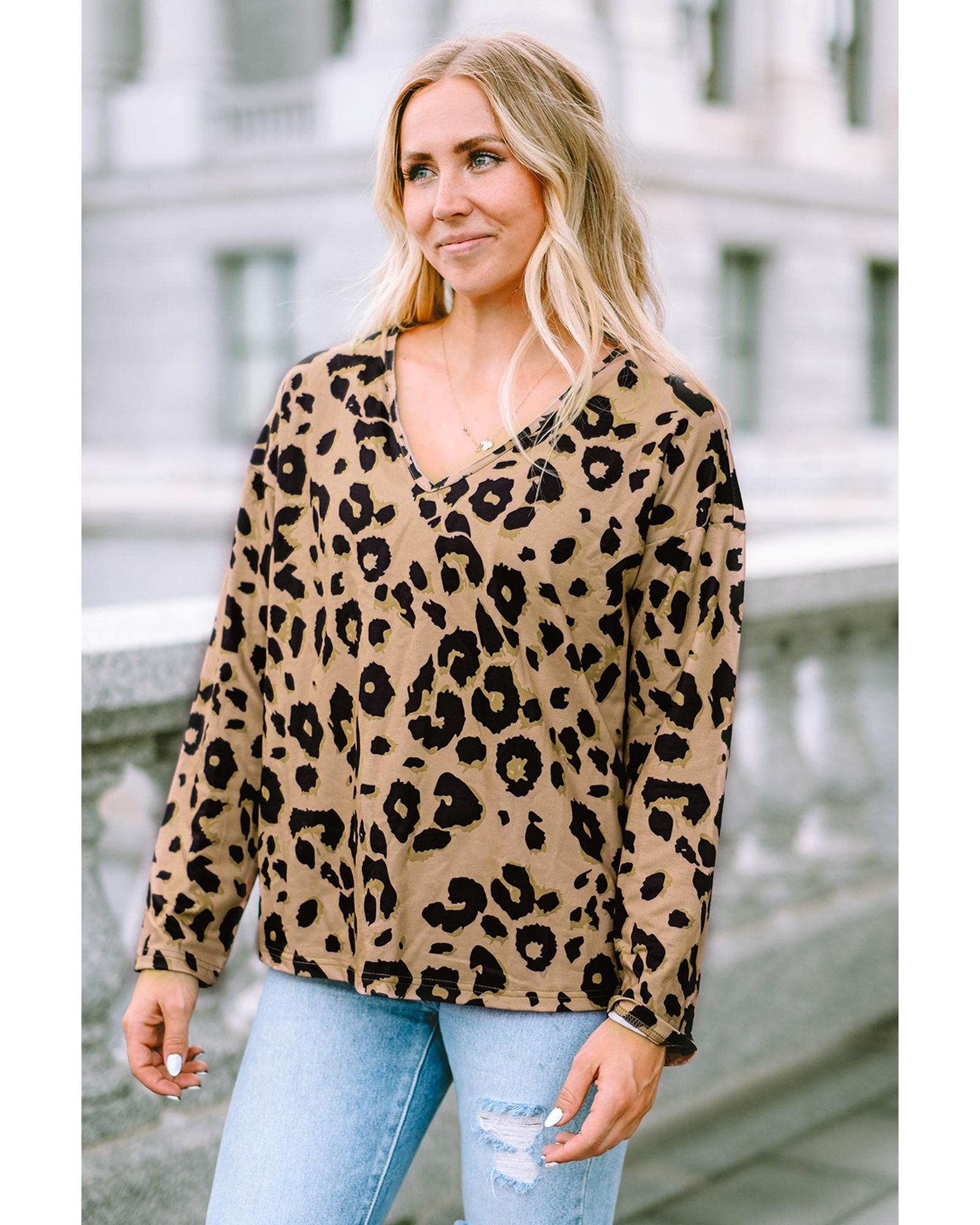 - Versatile Leopard Split Joint V Neck Long Sleeve Top