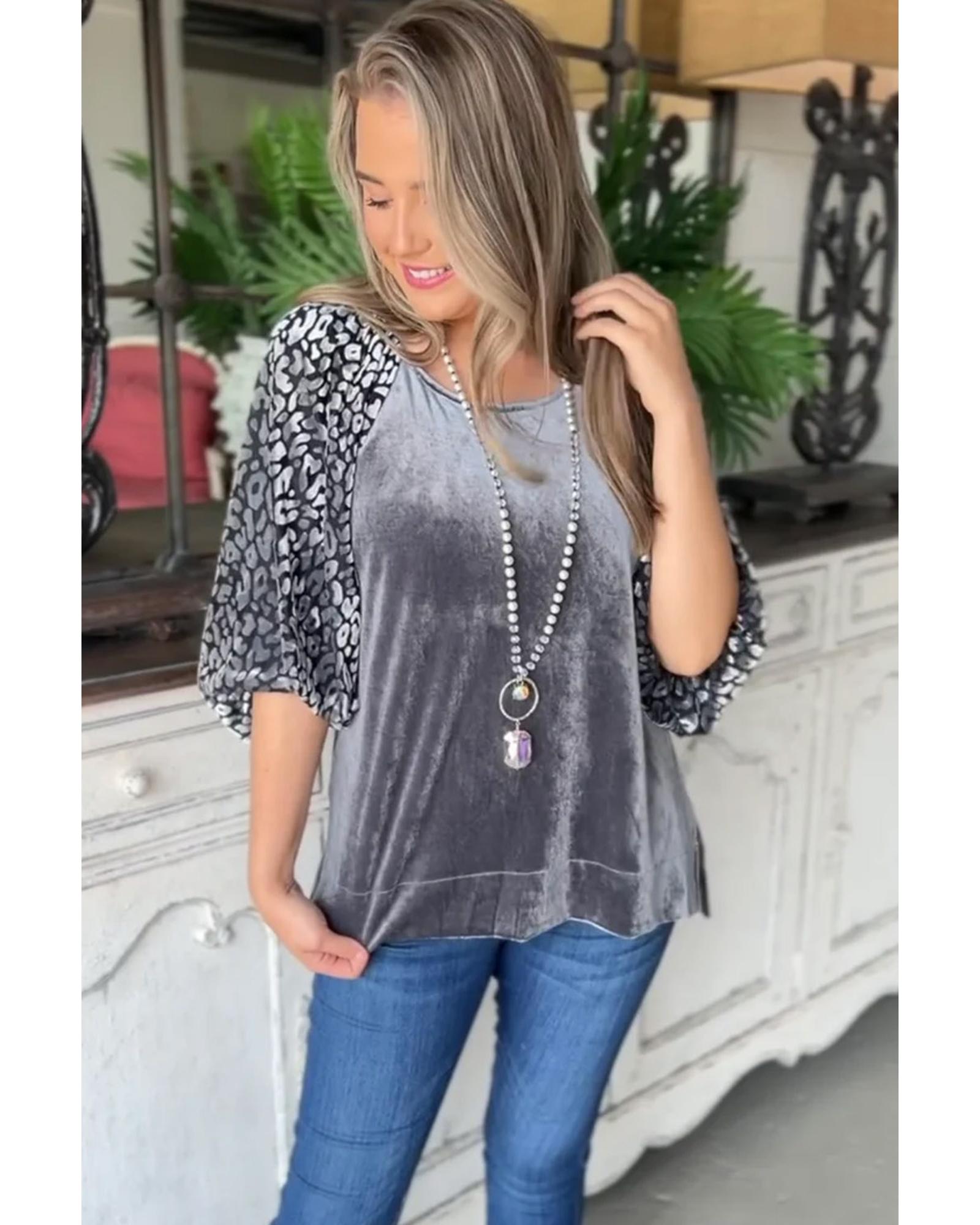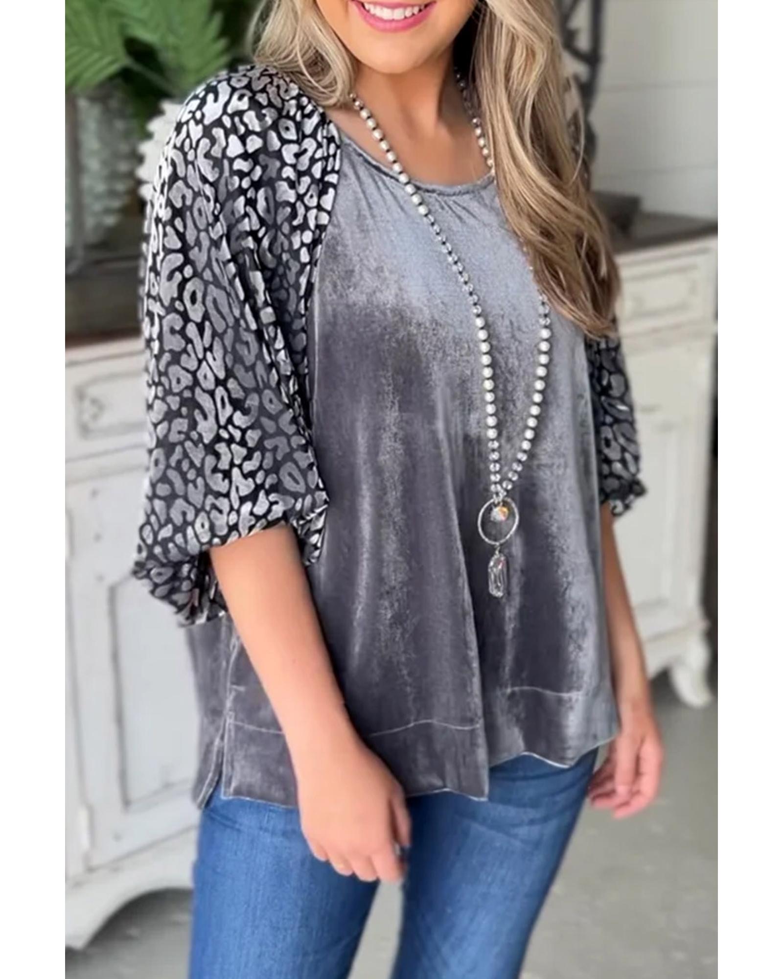 - Medium Grey Leopard Splicing Lantern Sleeve Velvet Blouse