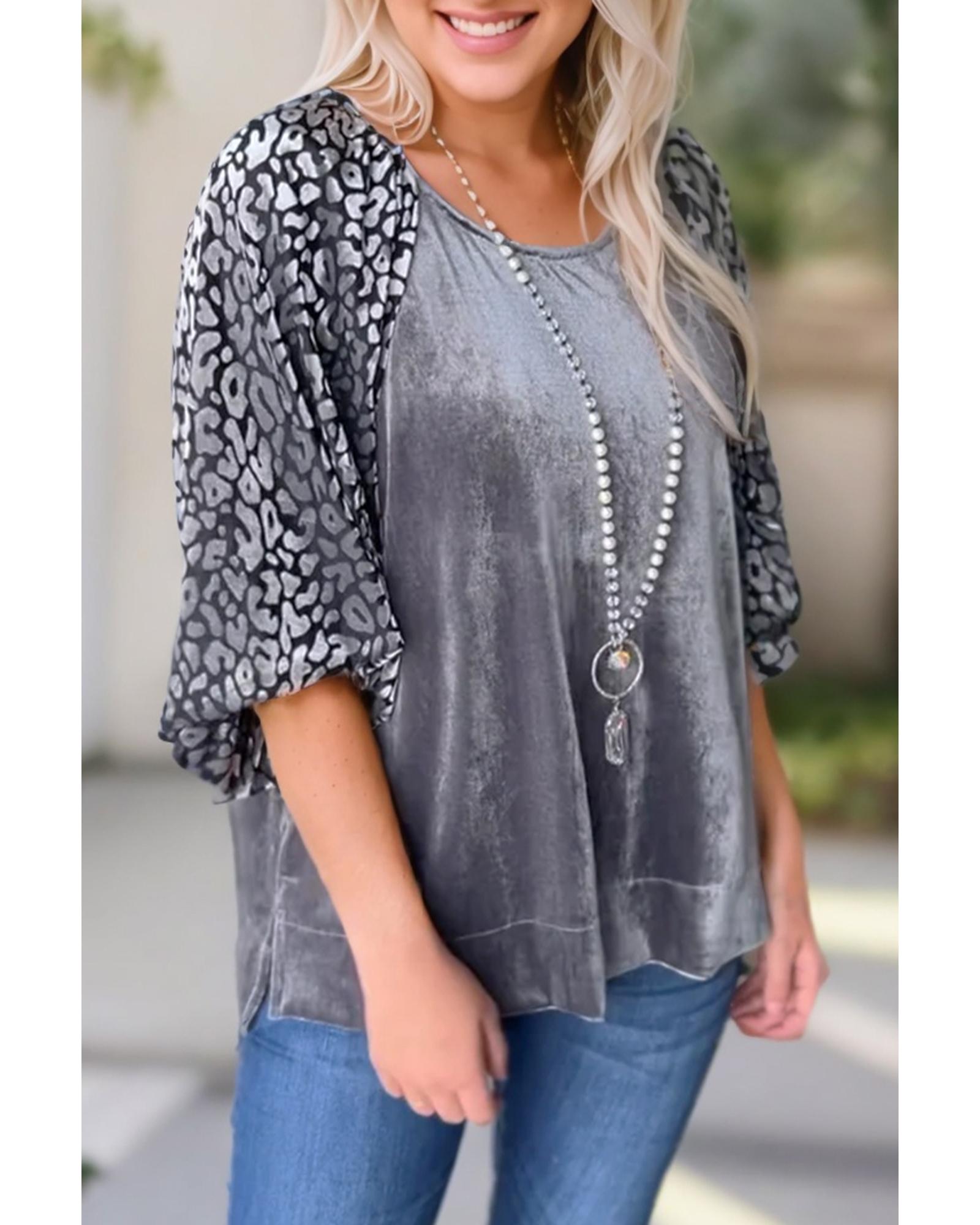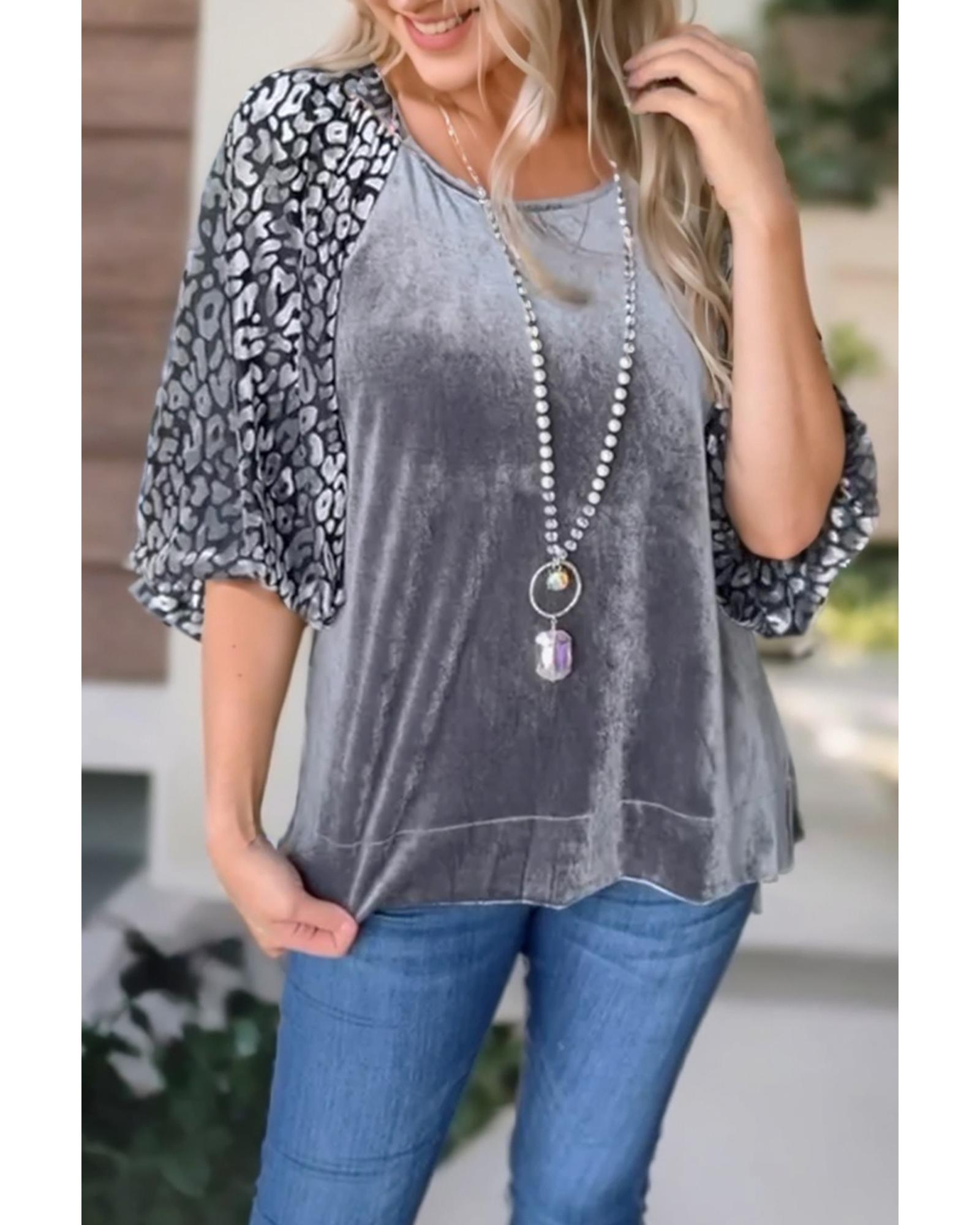 - Medium Grey Leopard Splicing Lantern Sleeve Velvet Blouse