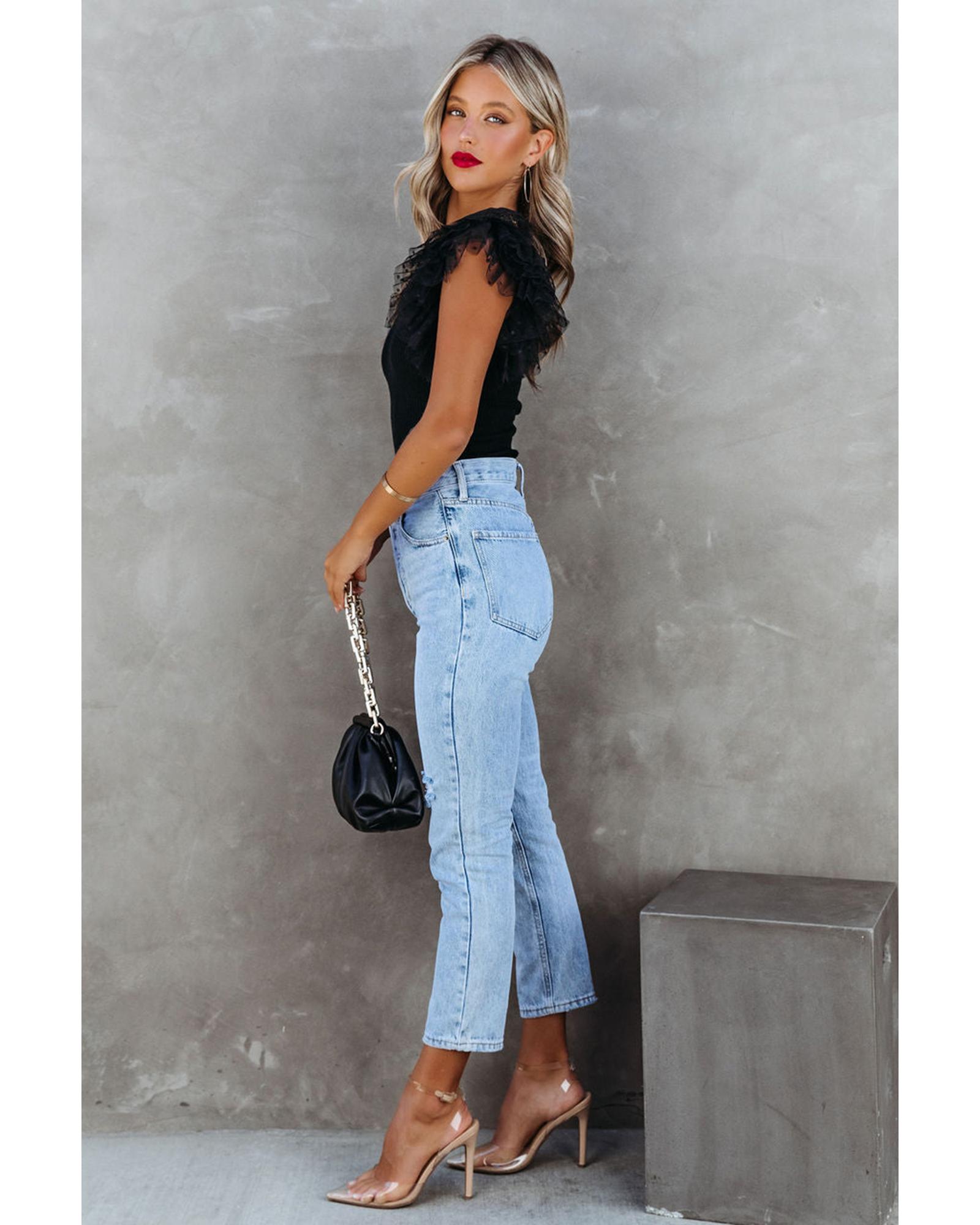 - Womens Dotty Mesh Ruffle Sleeve Ribbed Knit Top