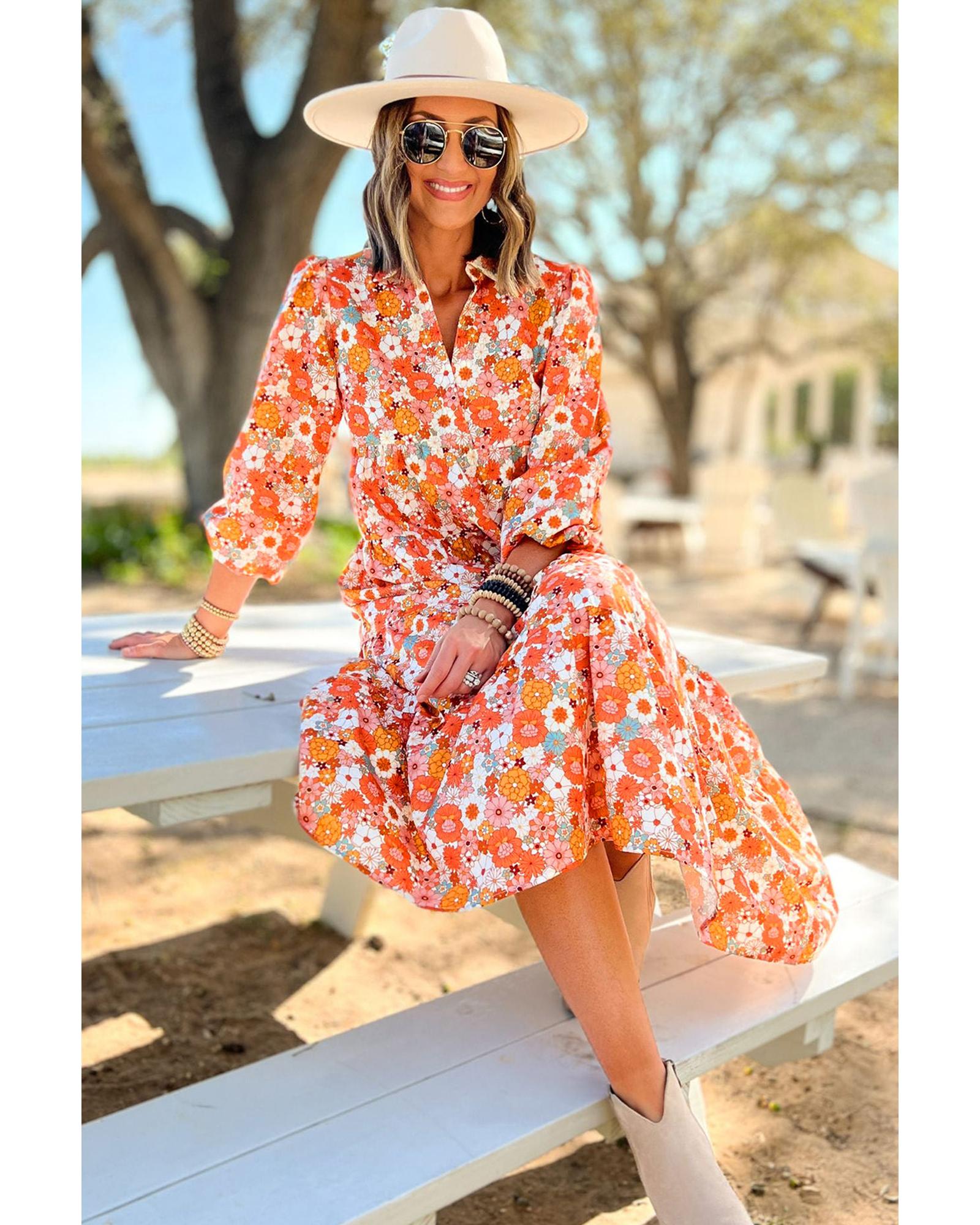 Azura Exchange Multicolor Boho Floral Collared Long Sleeve Ruffled Dress – M