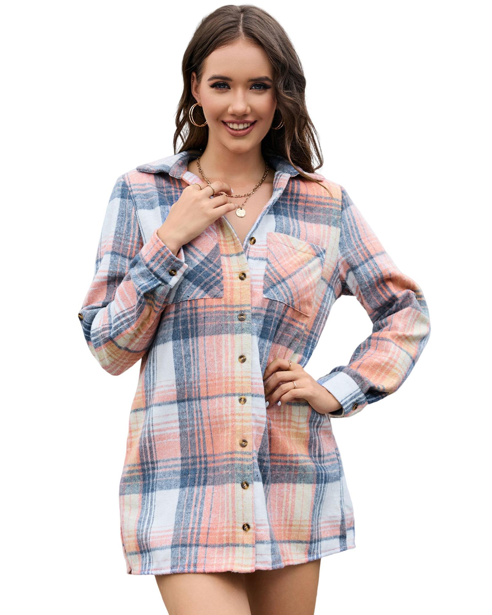 Azura Exchange Pink Plaid Roll-tab Sleeve Side Slit Shirt Dress – L
