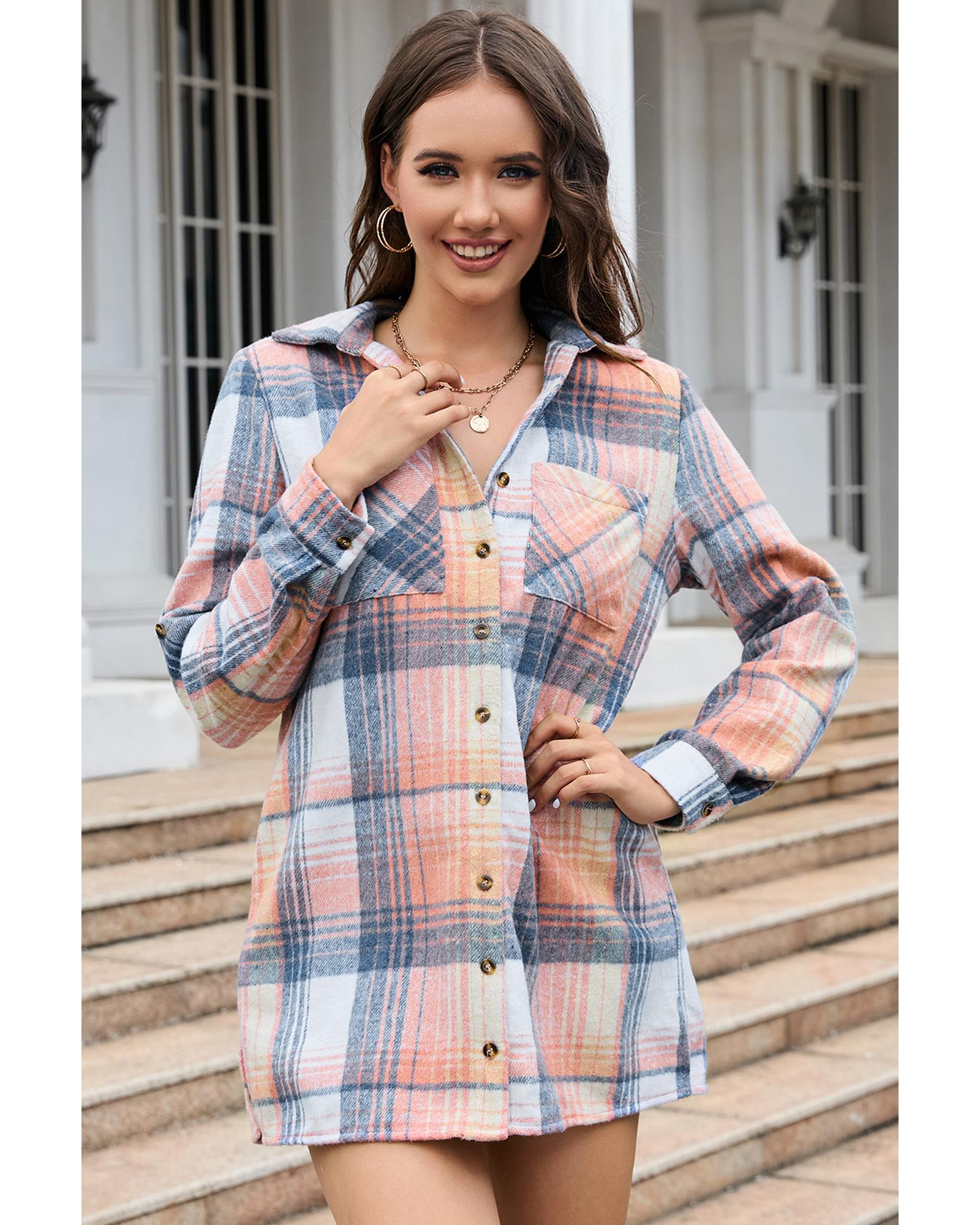 Azura Exchange Pink Plaid Roll-tab Sleeve Side Slit Shirt Dress – M
