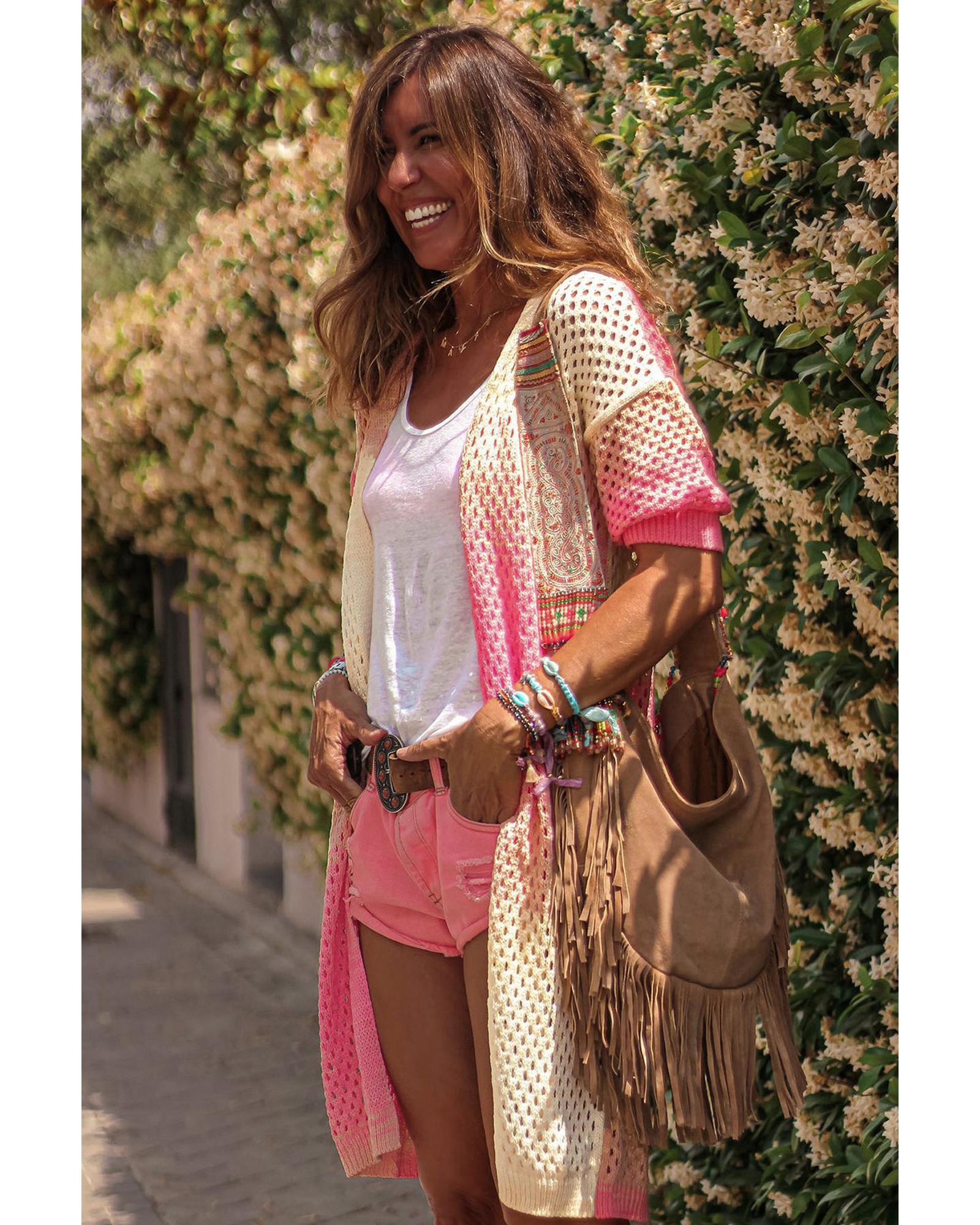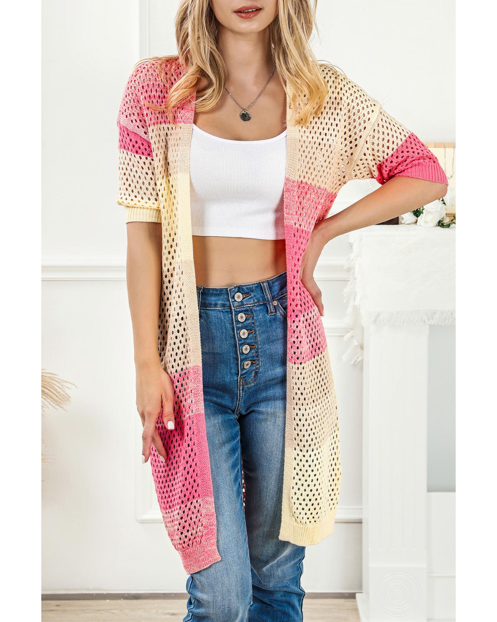 Azura Exchange Pink Ribbed Short Sleeve Ombre Eyelet Knitted Cardigan – L