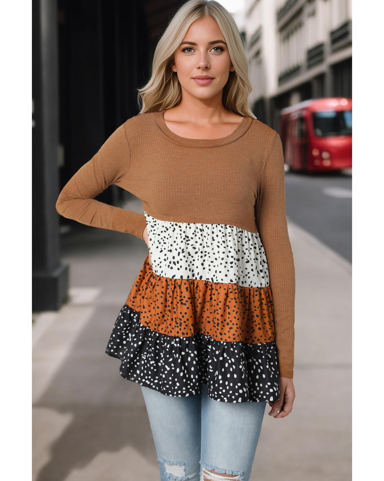 - Luxurious Brown Ribbed Long Sleeve Dotted Tiered Ruffled Flowy Top
