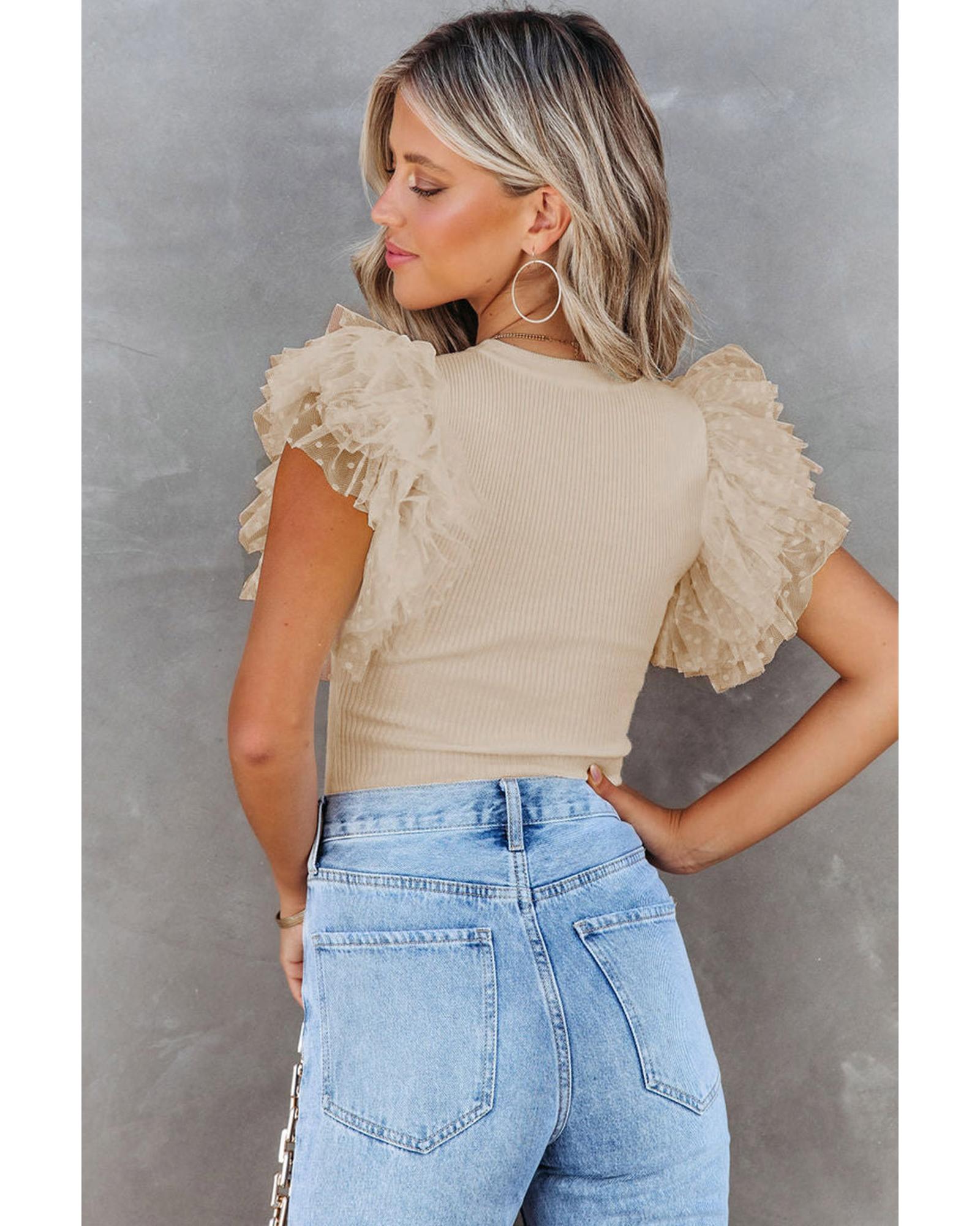 - Dotty mesh ruffle sleeves for a feminine touch
