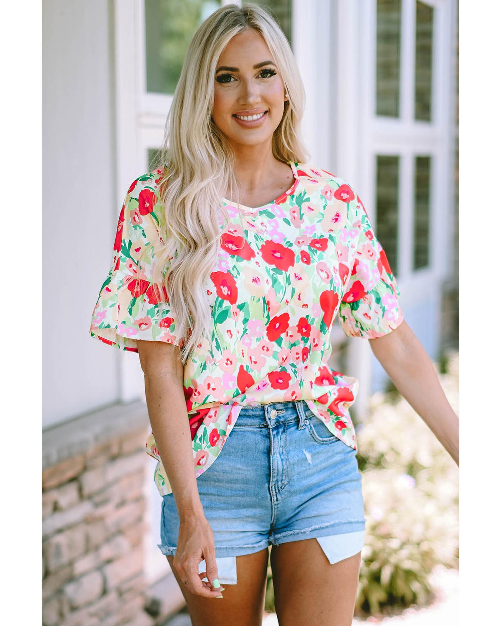 Azura Exchange Ruffled V Neck Floral Print Blouse - L