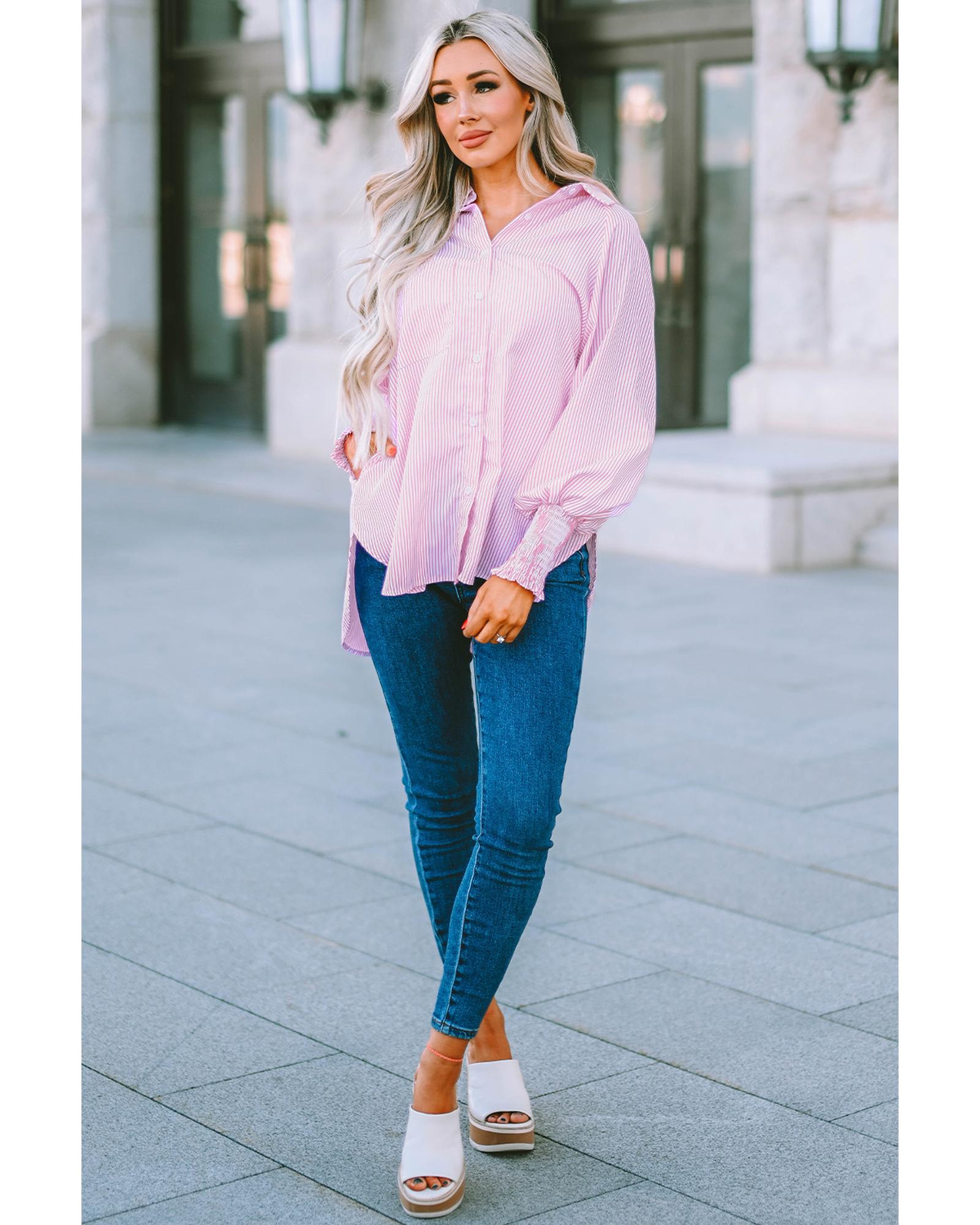 • Versatile and stylish Smocked Cuffed Striped Boyfriend Shirt with Pocket