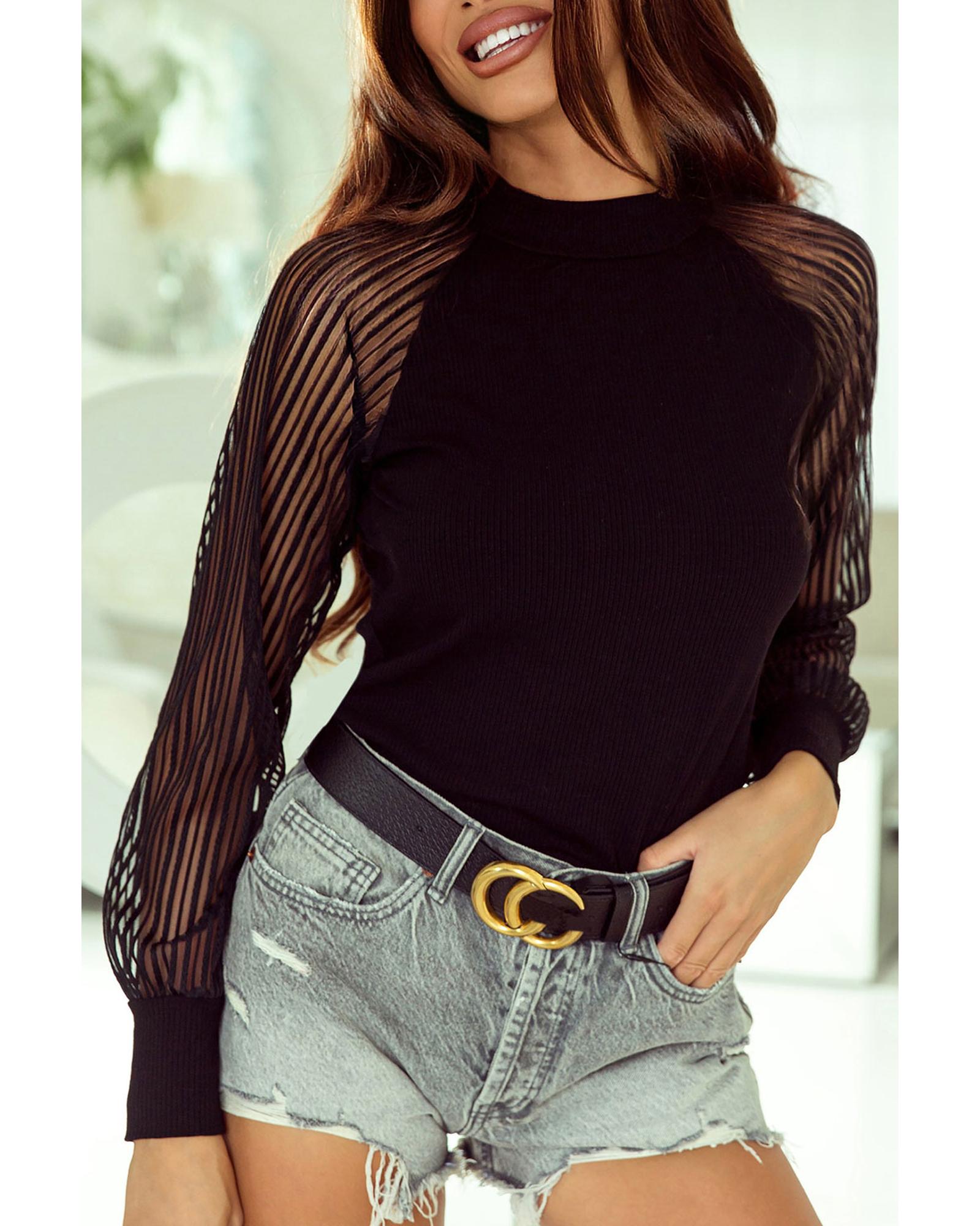Azura Exchange Striped Mesh Long Sleeve Crewneck Ribbed Top – L