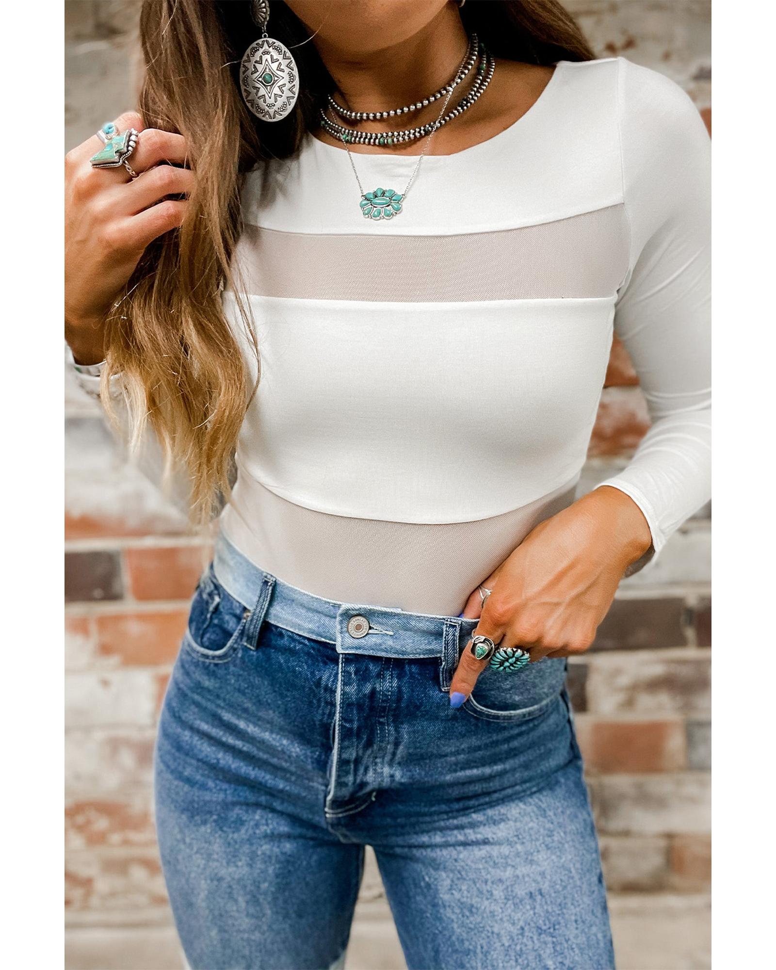Azura Exchange White Mesh Patchwork Long Sleeve Bodysuit – M