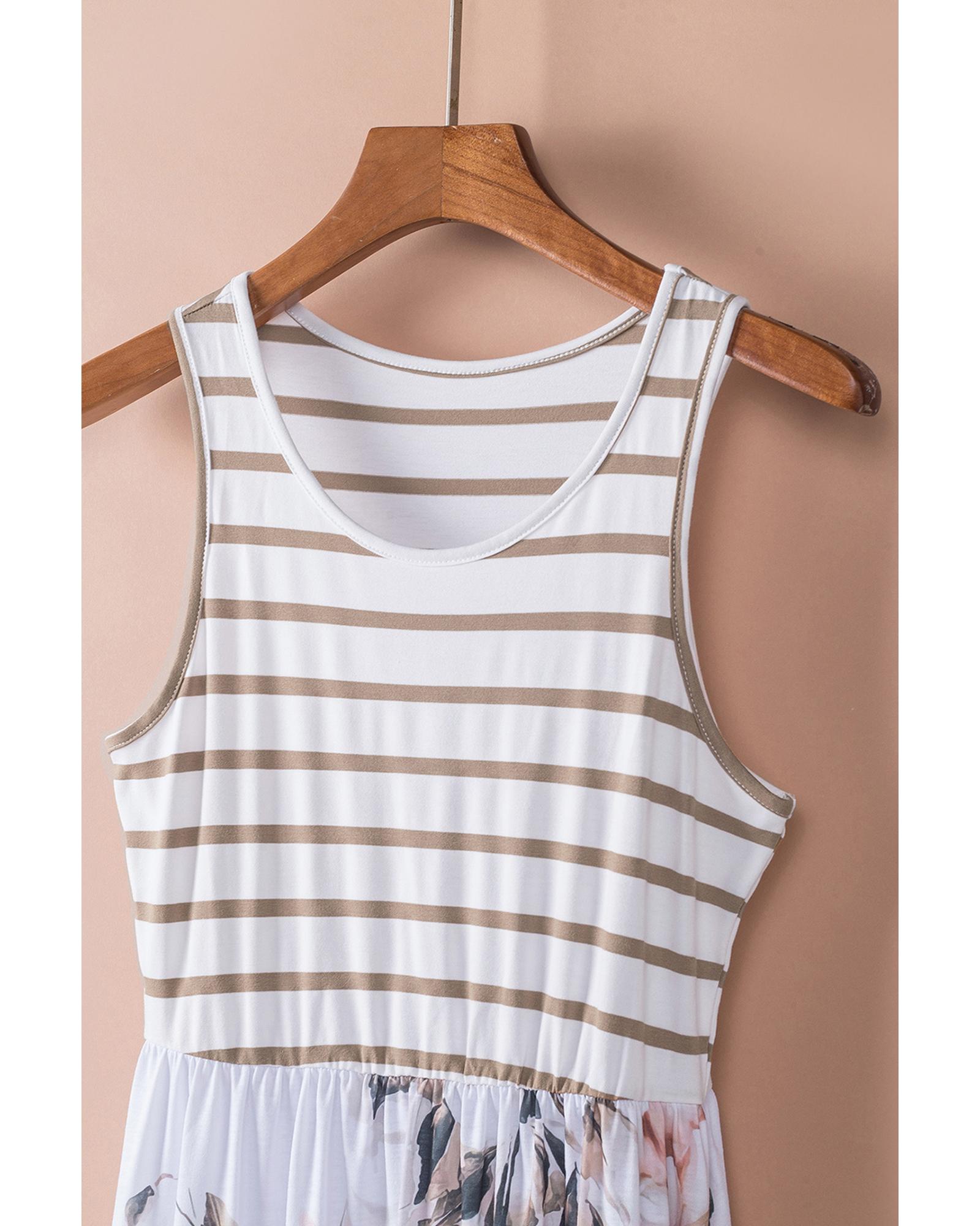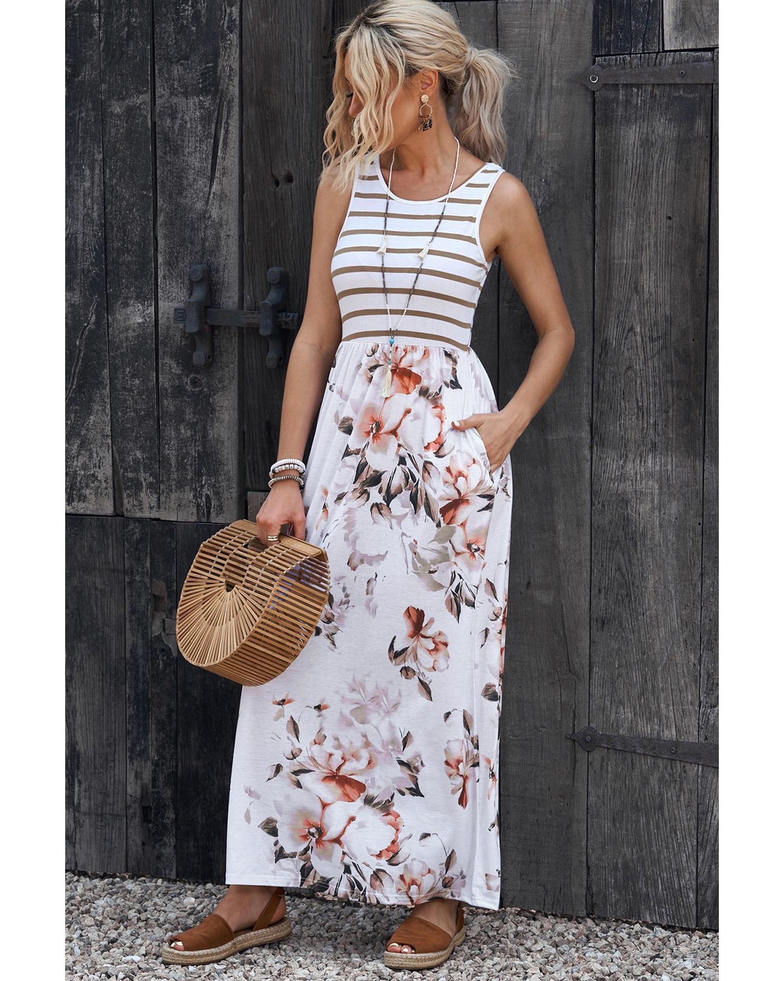 - White striped floral print sleeveless maxi dress