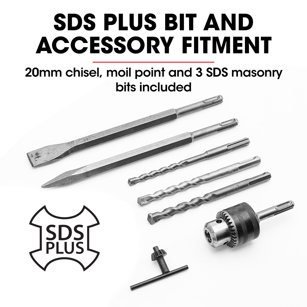 • Drill Bits: SDS Plus with standard chuck adaptor and key included