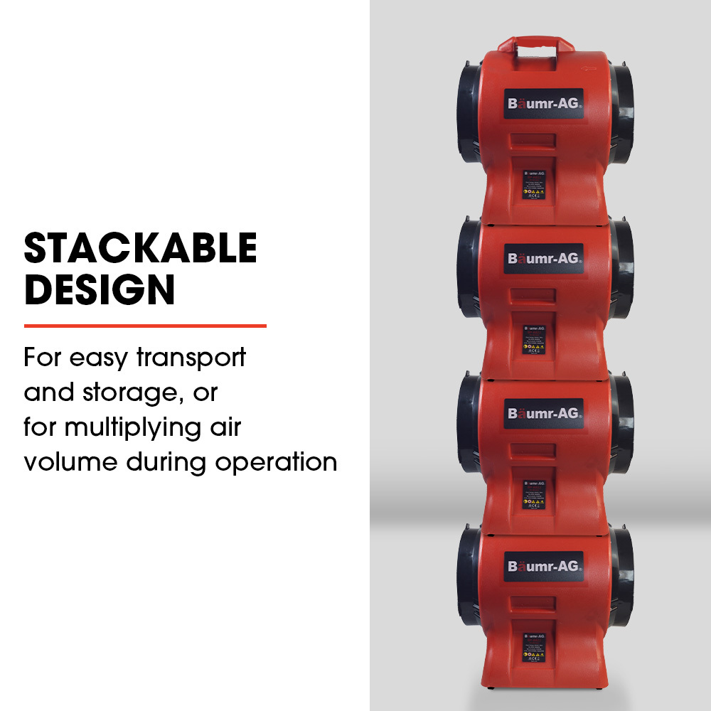 Designed with portability in mind, the compact Baumr-AG Air Blower has a carry handle and only weighs in at 13kg. It can conveniently be stacked up to 4 high for easy storage or transport, or to multiply air volume.