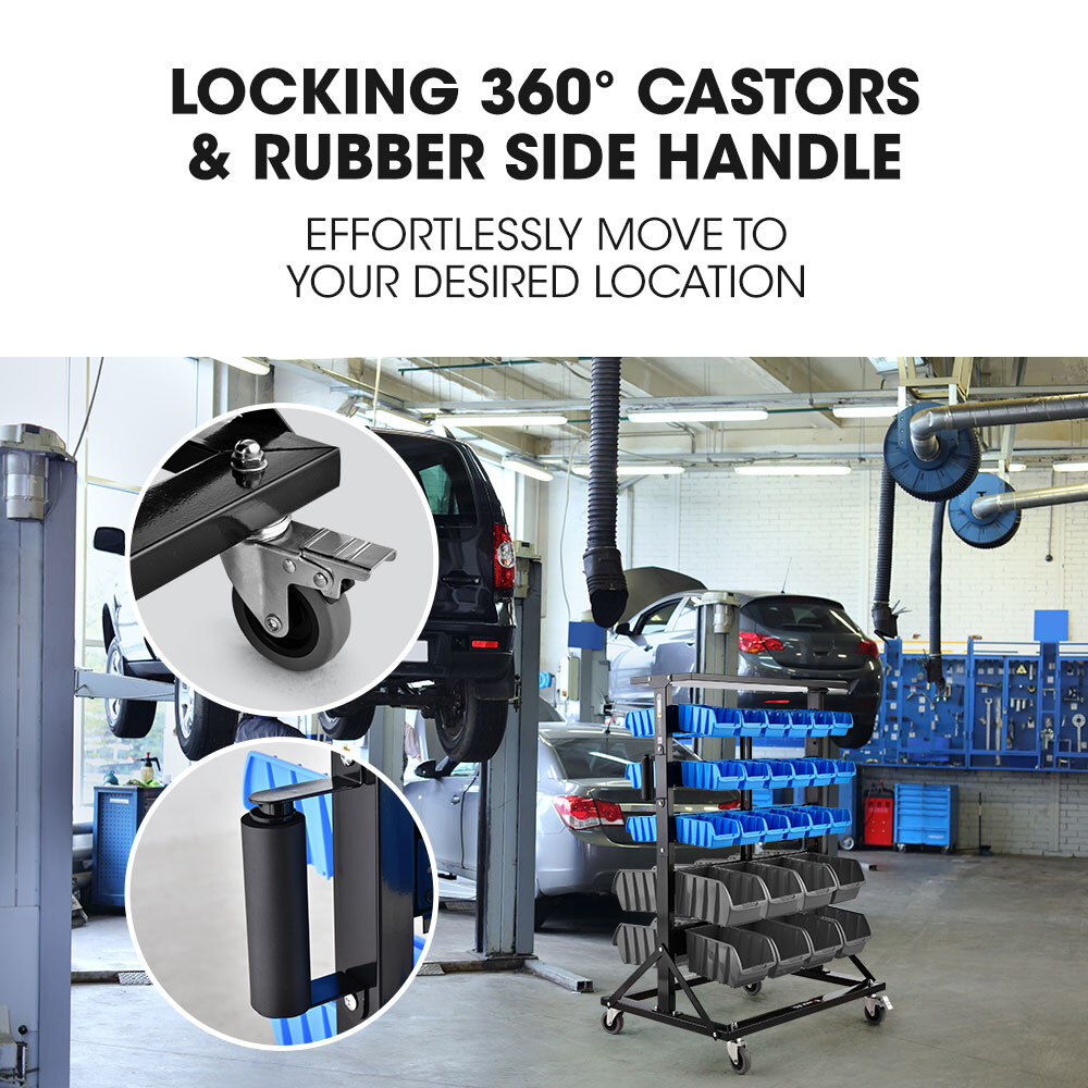The tough injection moulded polypropylene tubs come in two sizes and are easy to remove and place back on the rails. Slots on the front of the tubs give you the option of labelling your parts and hardware. Locking 360° castors and the rubber side handle allow you to effortlessly move the rack to your desired location.