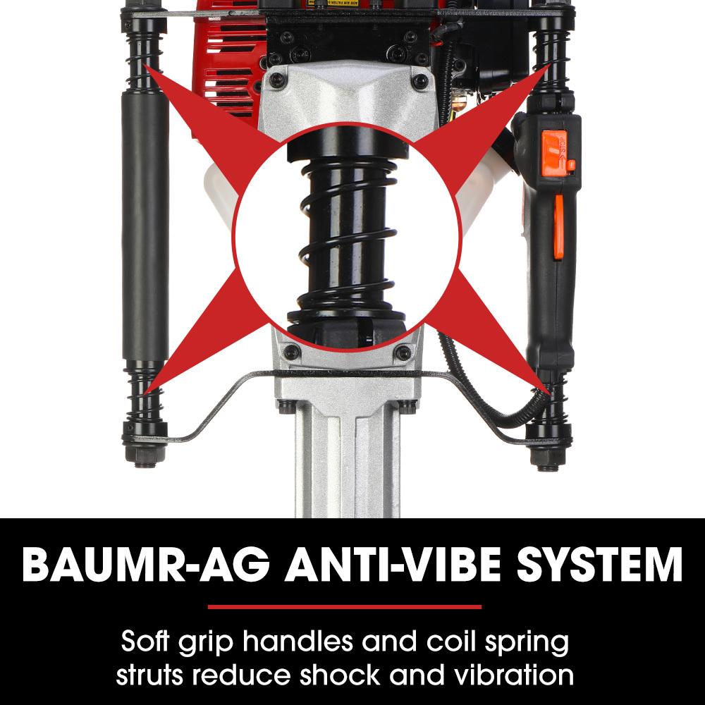 The power delivered by the Baumr-AG post rammer is significantly higher in frequency and impact energy than a manual driver. The 1800BPM ram head delivers a massive 55J per beat, efficiently driving whatever you need put in the ground.;