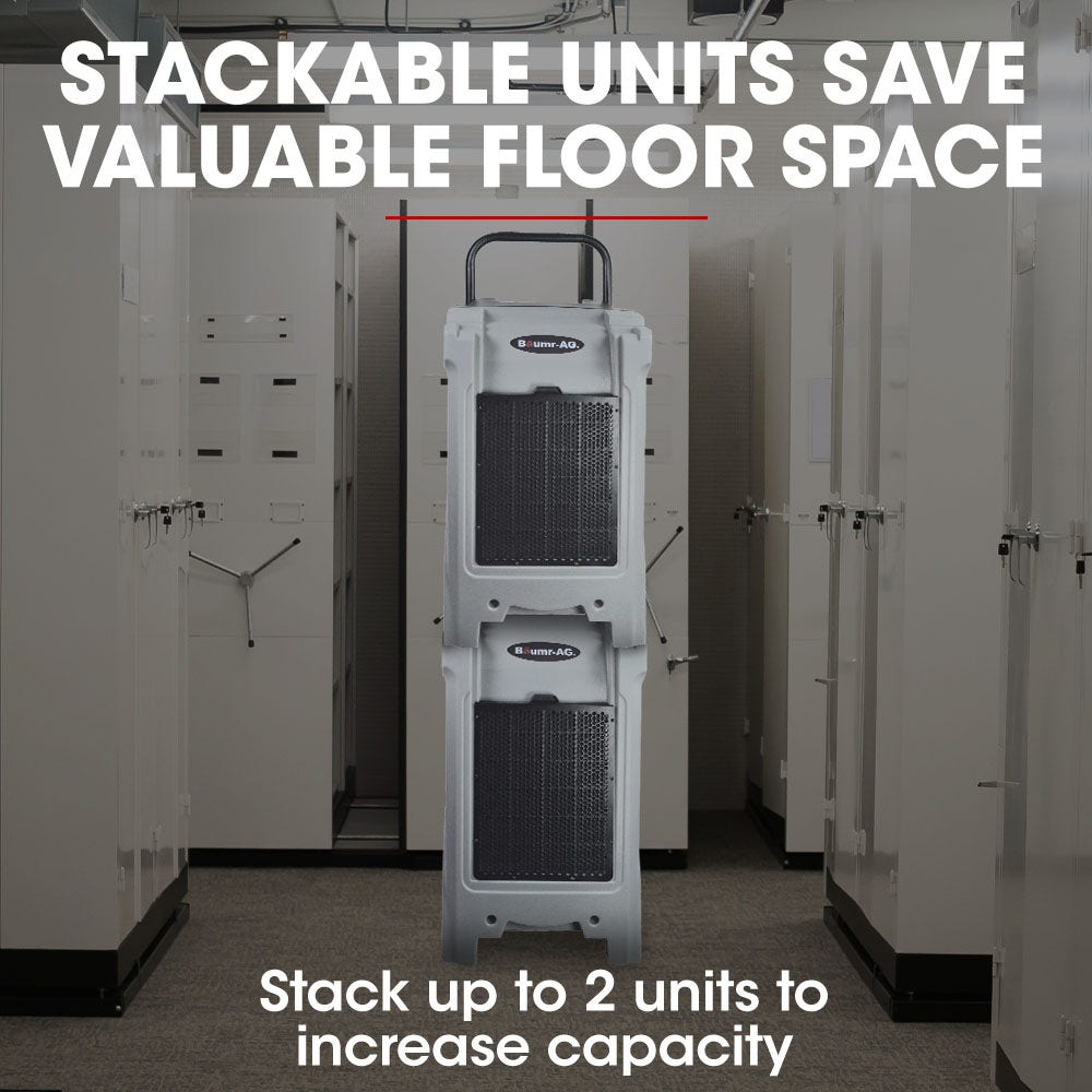 But that’s not all – the Baumr-AG range boasts a range of user-friendly features, including an automatic drain pump, stackable hard polymer shell with large wheels, energy star rating, self-monitoring system, duct connection option, and automatic humidistat control with LED. It even has auto defrost and purging, digital humidistat, drain indicator, timer and money-saving washable filter.